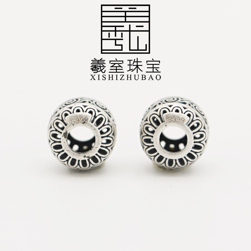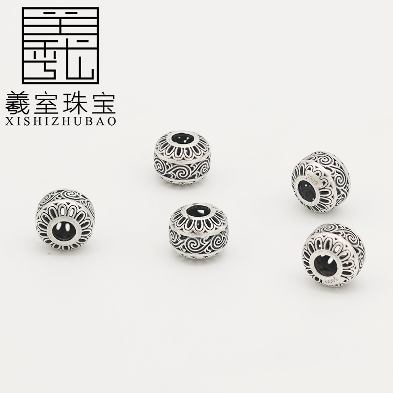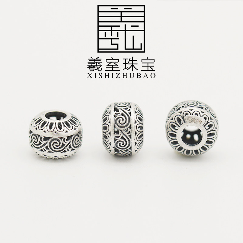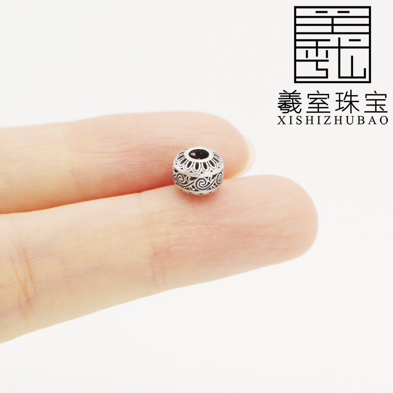 羲室S999纯银隔珠 复古做旧镂空小花卷草纹圆桶珠DIY银饰串珠配件
