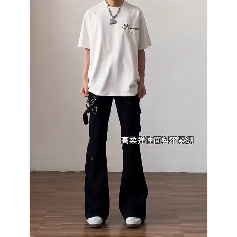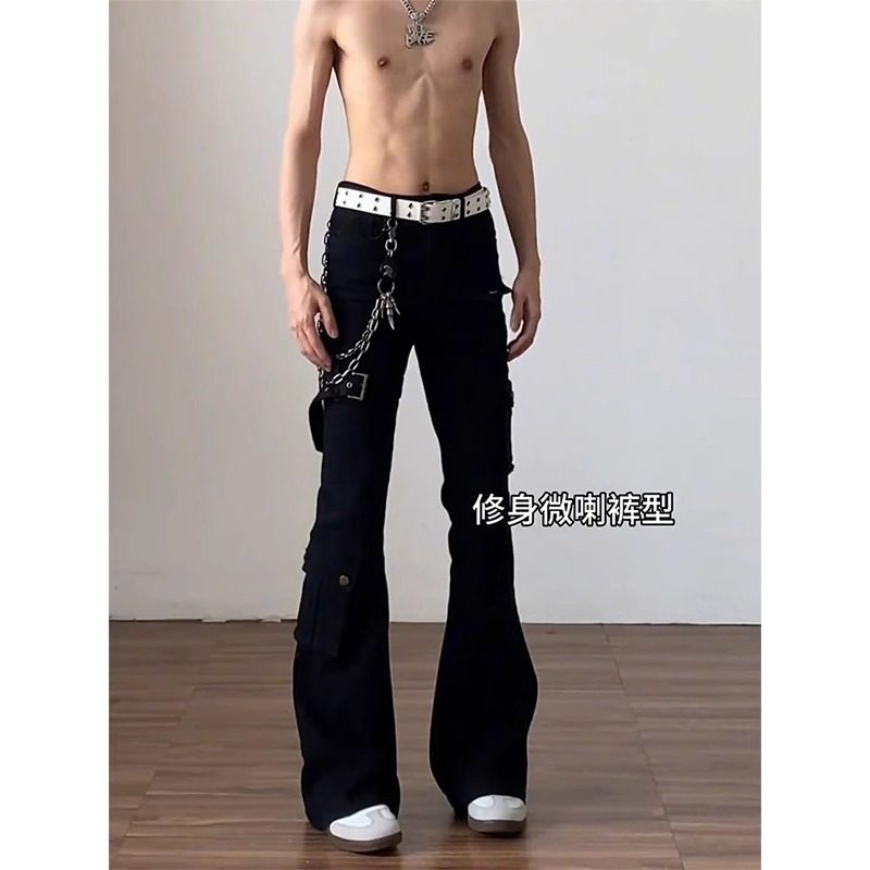 男cleanfit美式 子冬季 高街vibe喇叭修身 裤 工装 白色绑带微喇牛仔裤