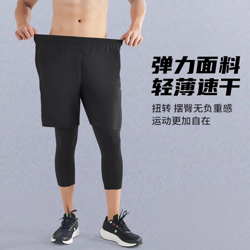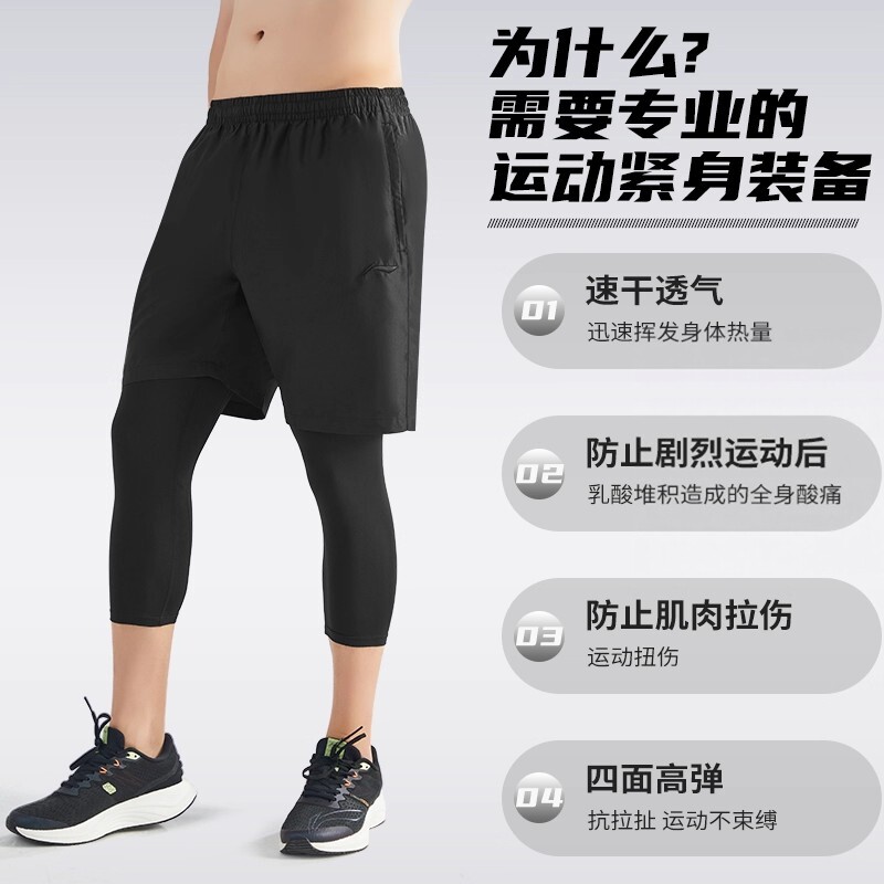 李宁跑步紧身裤 男压缩高弹训练速干健身运动篮球打底假两件七分裤