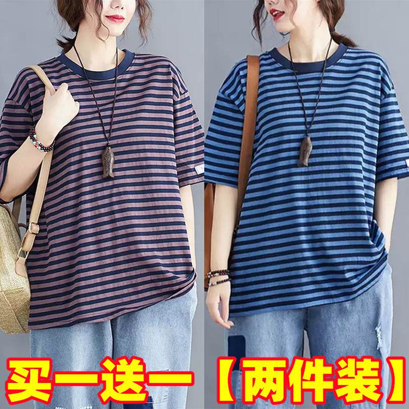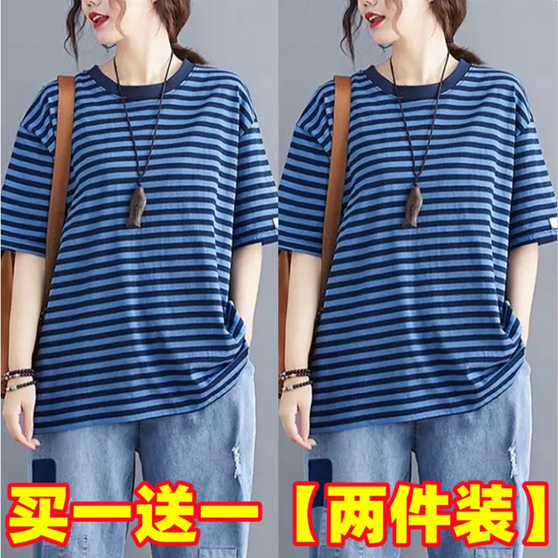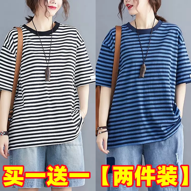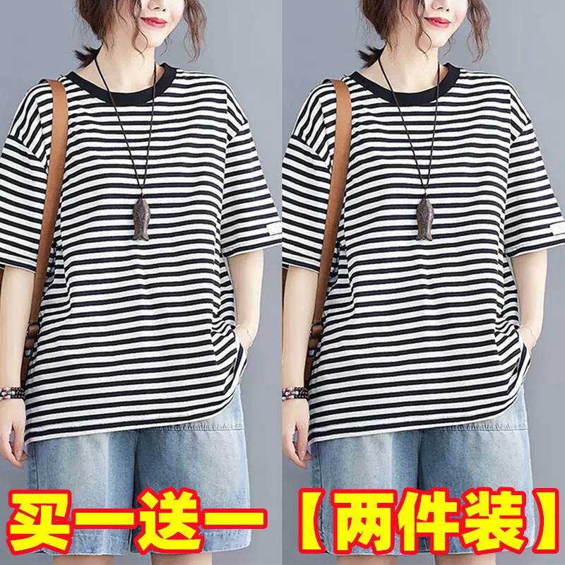 韩版 夏季 条纹纯棉t恤女200斤宽松遮肉显瘦休闲上衣 女装 胖mm特大码