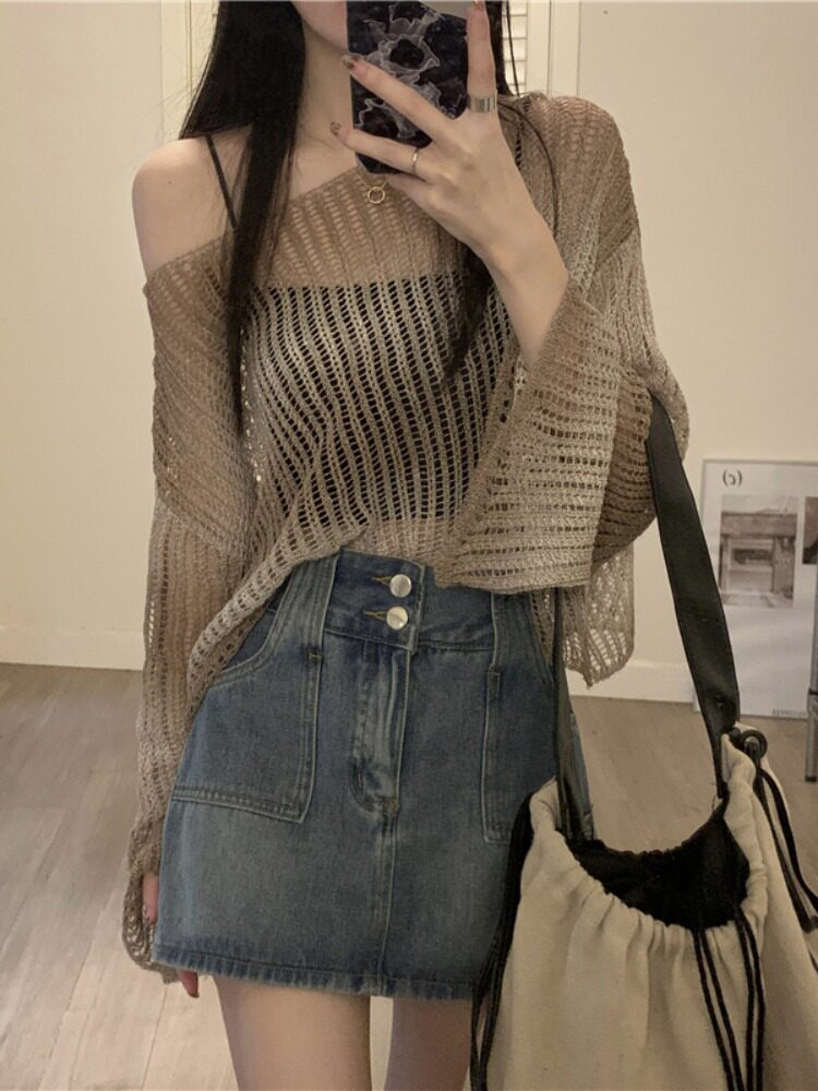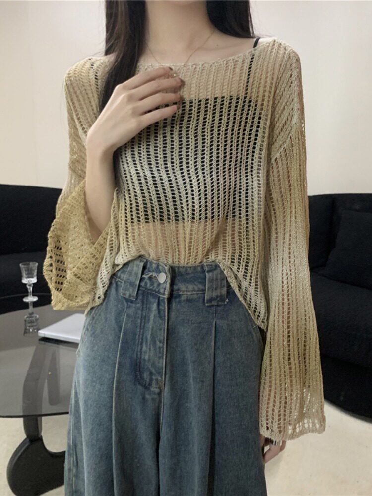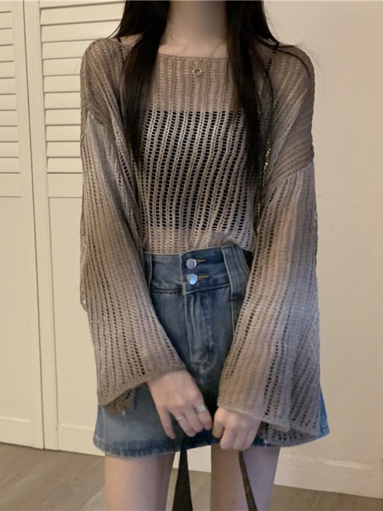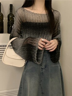 空调罩衫 宽松慵懒薄款 设计感针织上衣 女夏季 渐变色镂空冰丝防晒衫
