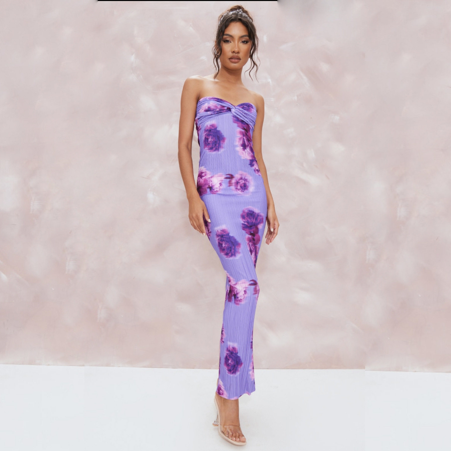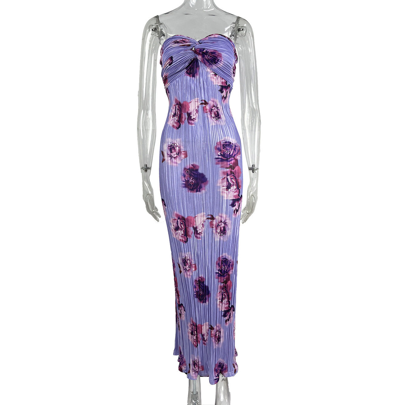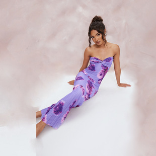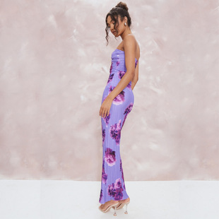 23欧美跨境亚马逊爆款 显瘦女连衣长裙HY027B 抹胸露背印花压褶修身