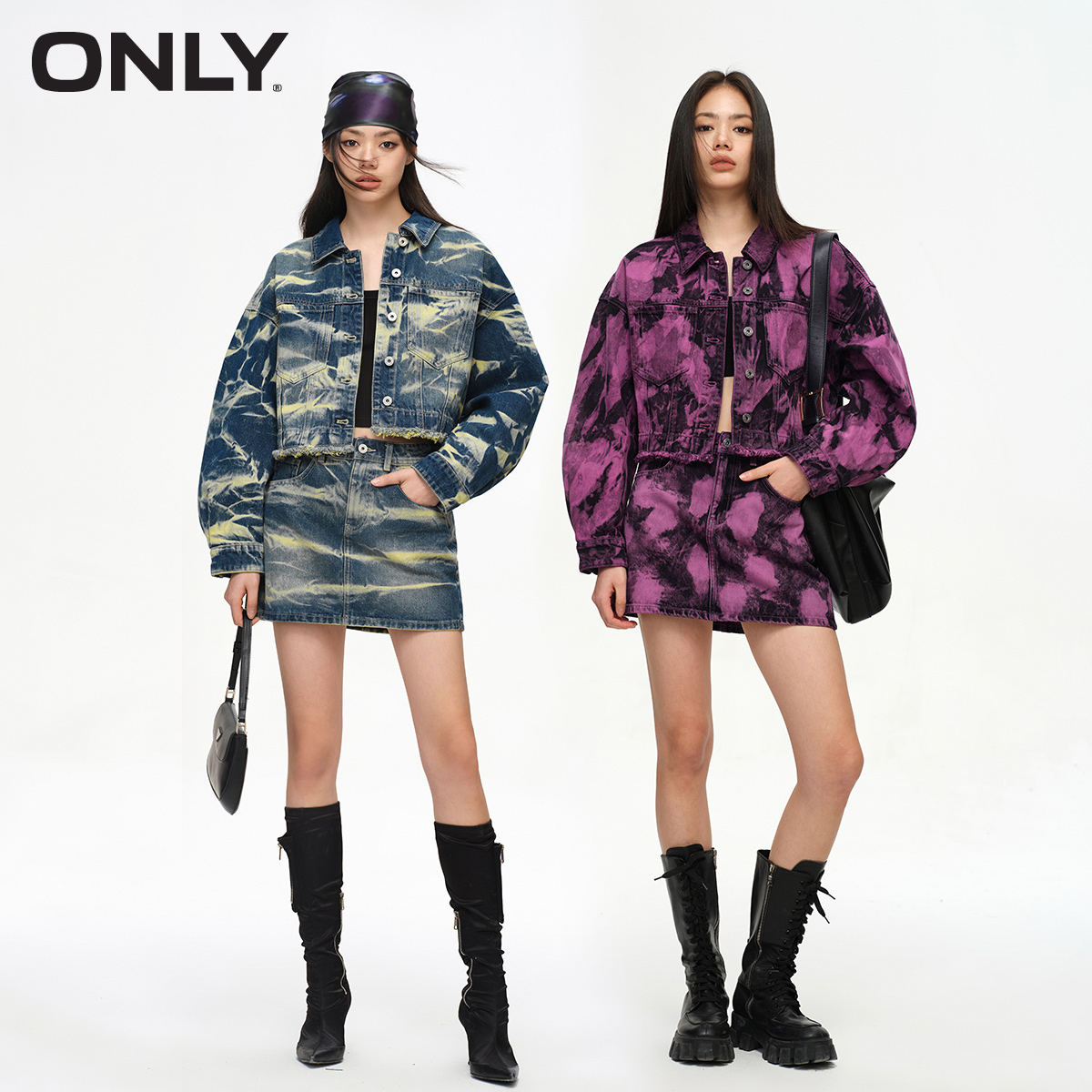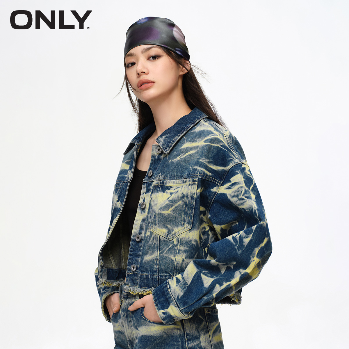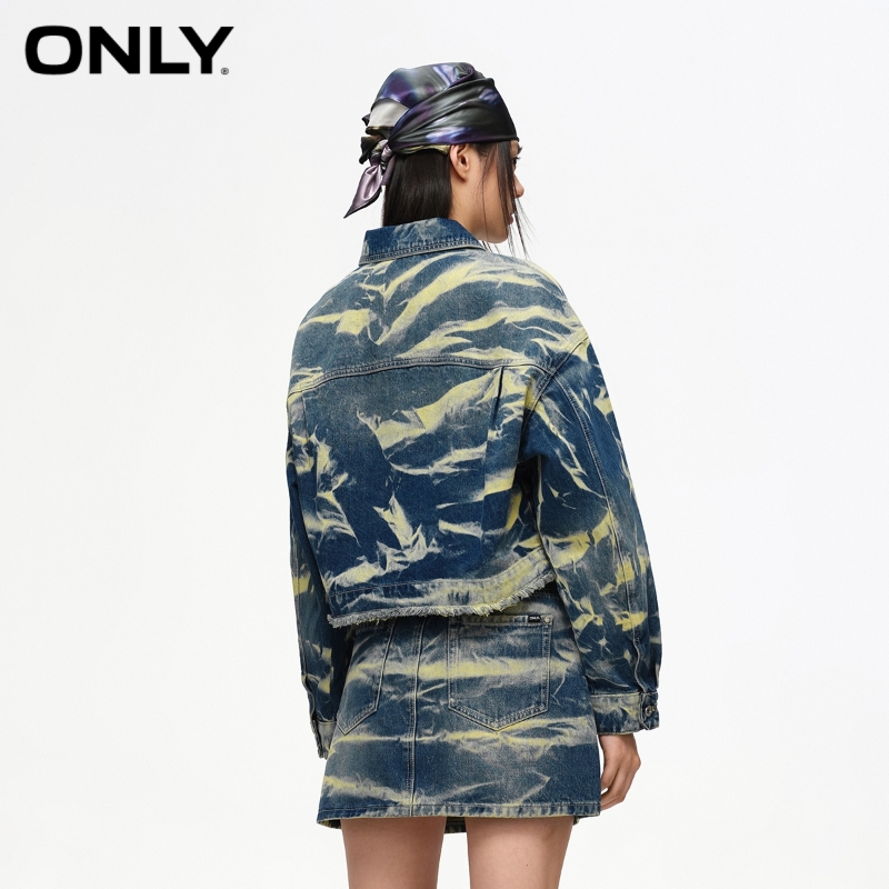 124154020 牛仔外套女 ONLY秋季 潮酷做旧晕染毛边翻领短款