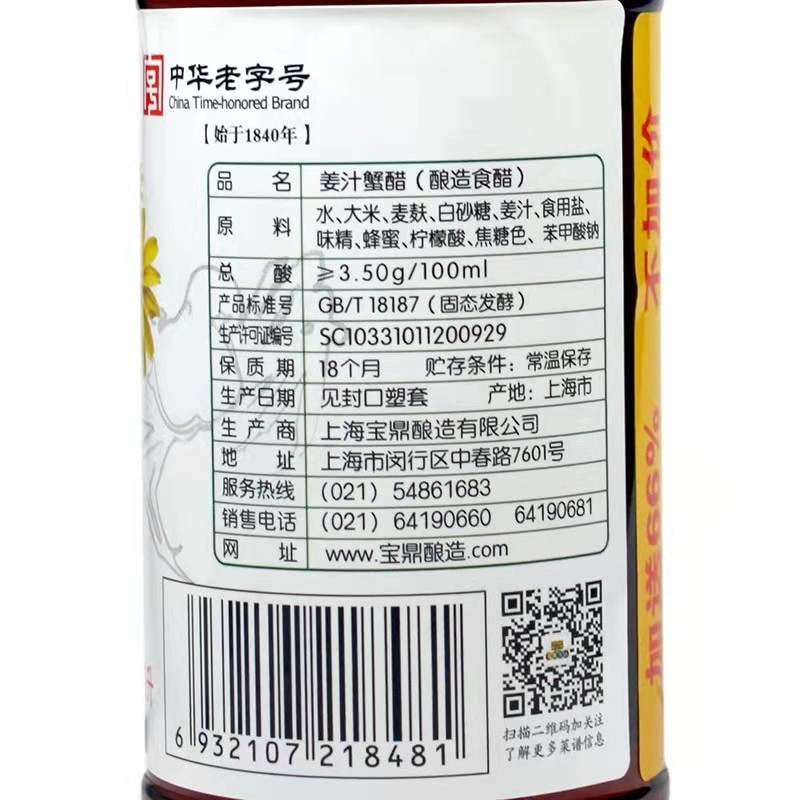 宝鼎天鱼姜汁蟹醋250ml瓶装 酿造食用醋海鲜醋螃蟹醋大闸蟹专用醋