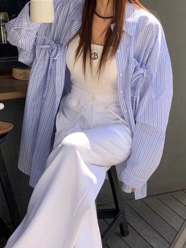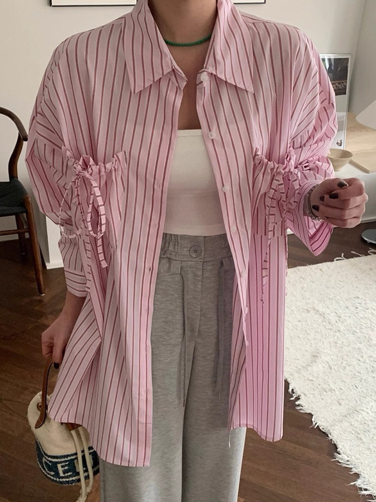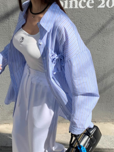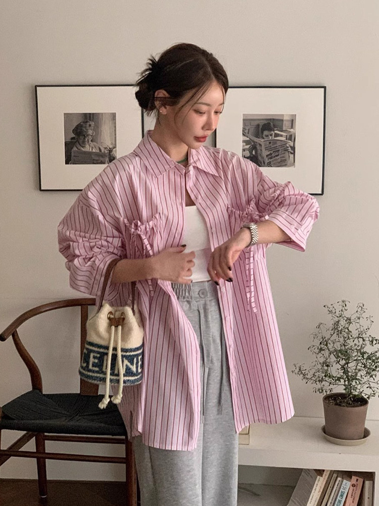 韩国chic春夏甜美慵懒风翻领系带口袋设计宽松百搭长袖 女 条纹衬衫