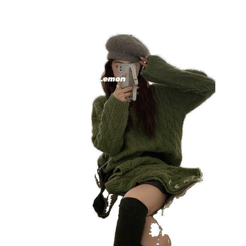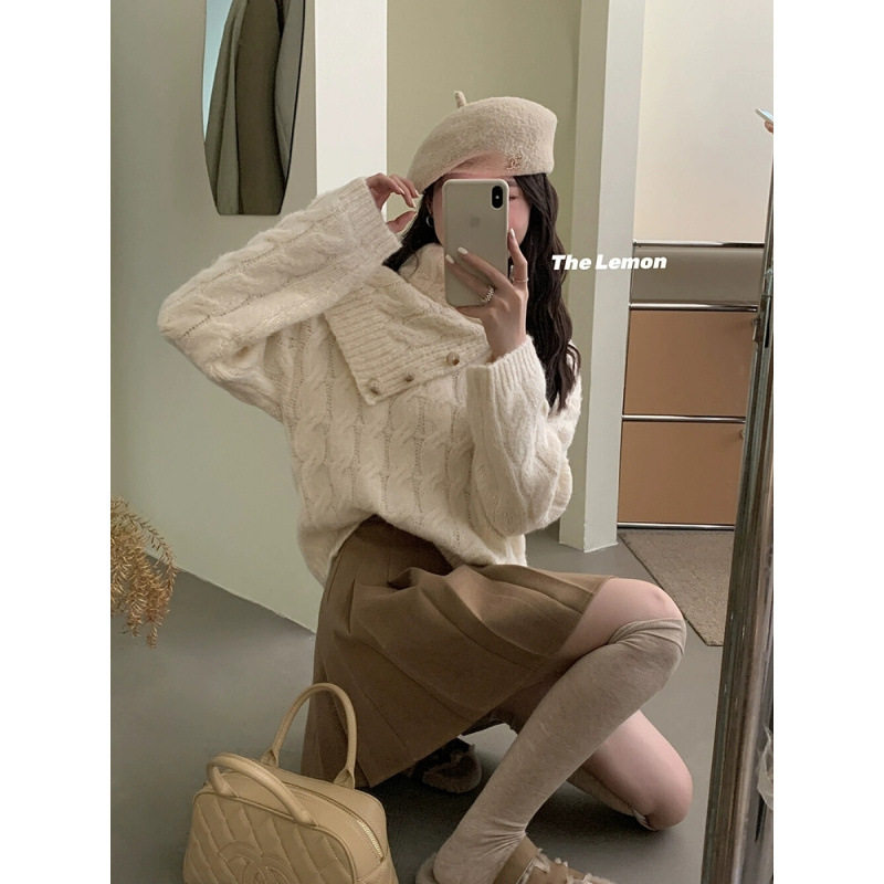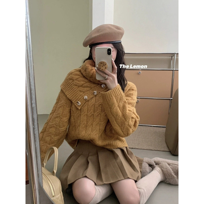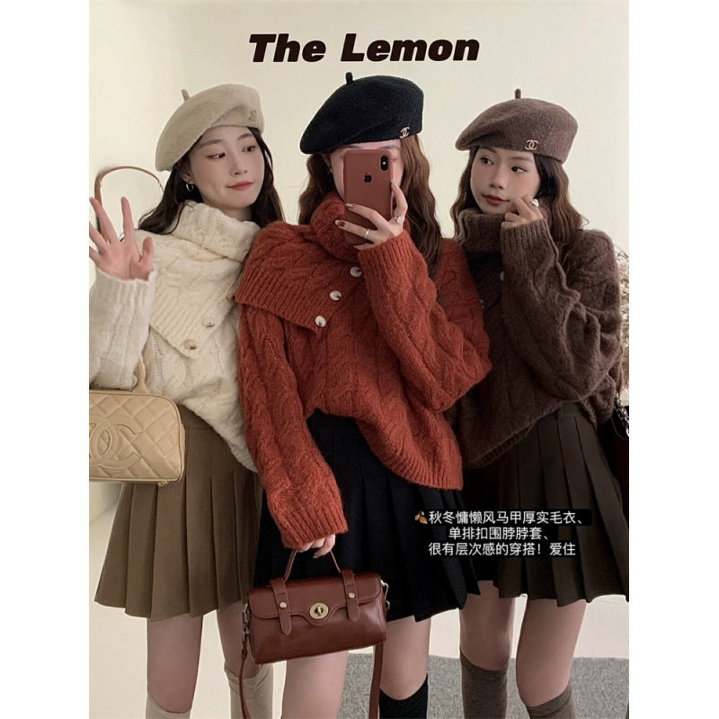 THE LEMON韩系ins慵懒风麻花编织设计感毛衣单排扣围脖披肩毛衣女
