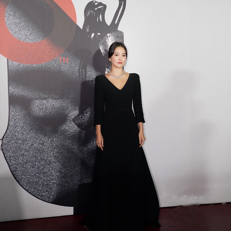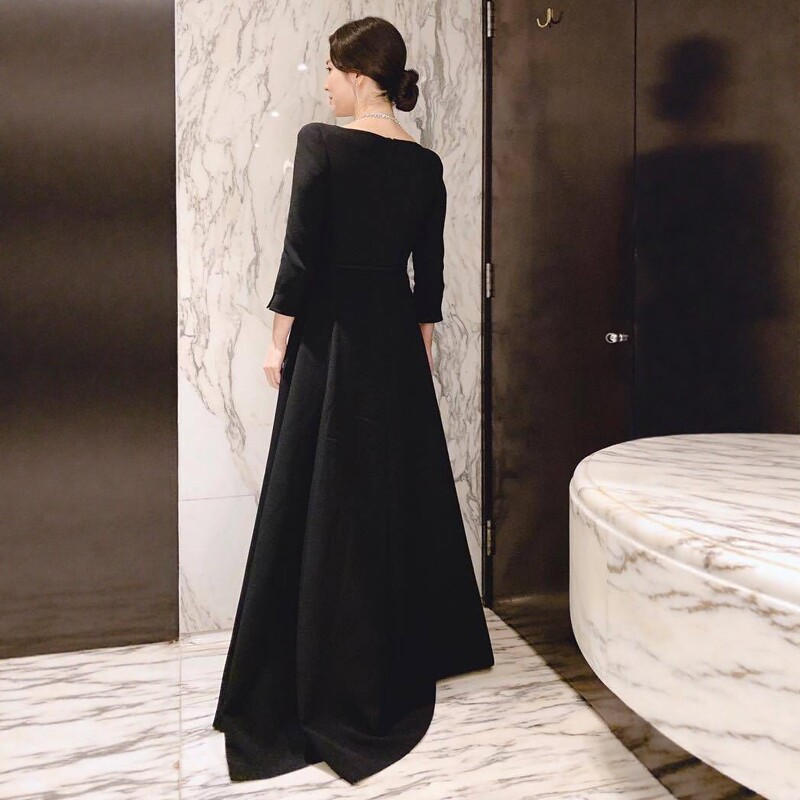 V领收腰长礼服宴会年会 黑色礼服OL风复古长袖 宋慧乔同款 春秋新款
