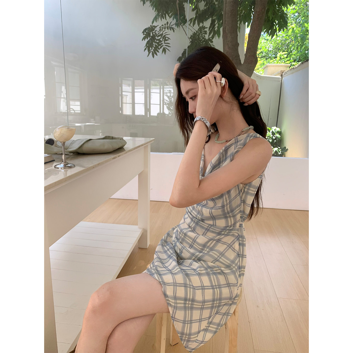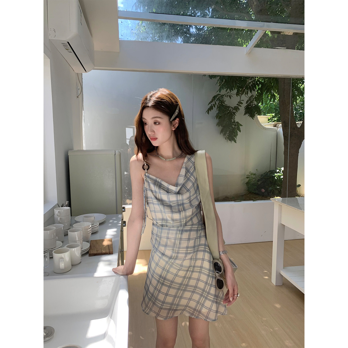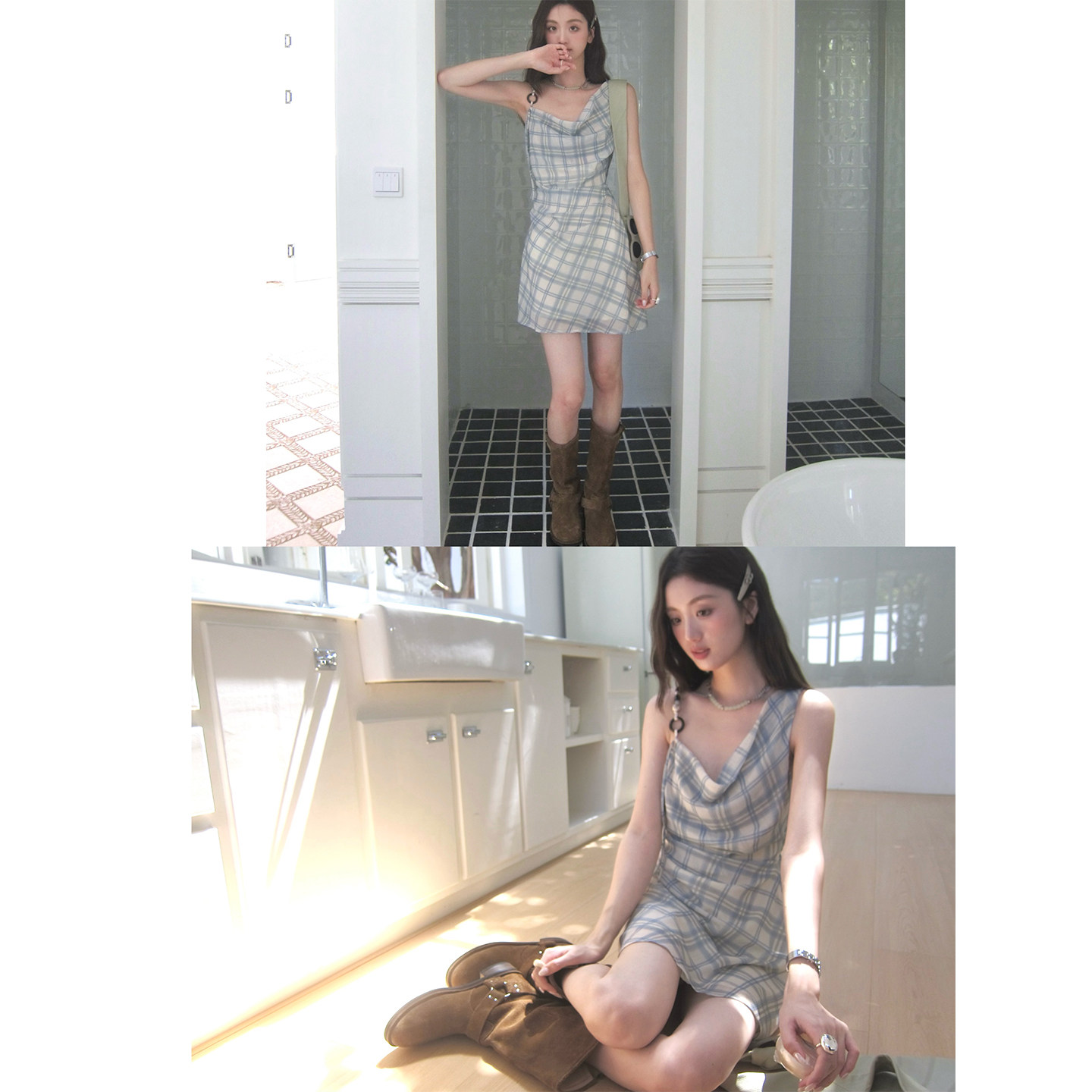 soolrok 不对称肩带荡领串珠背心连衣裙格纹抽褶短裙 松未韵一
