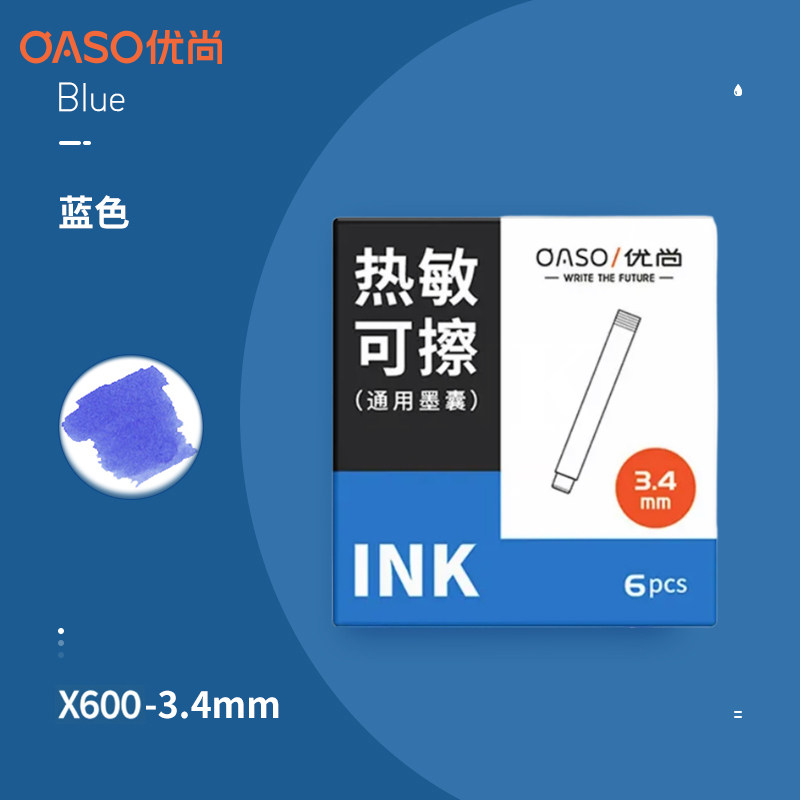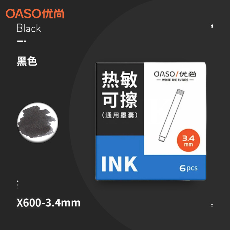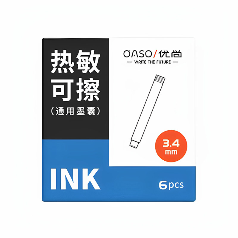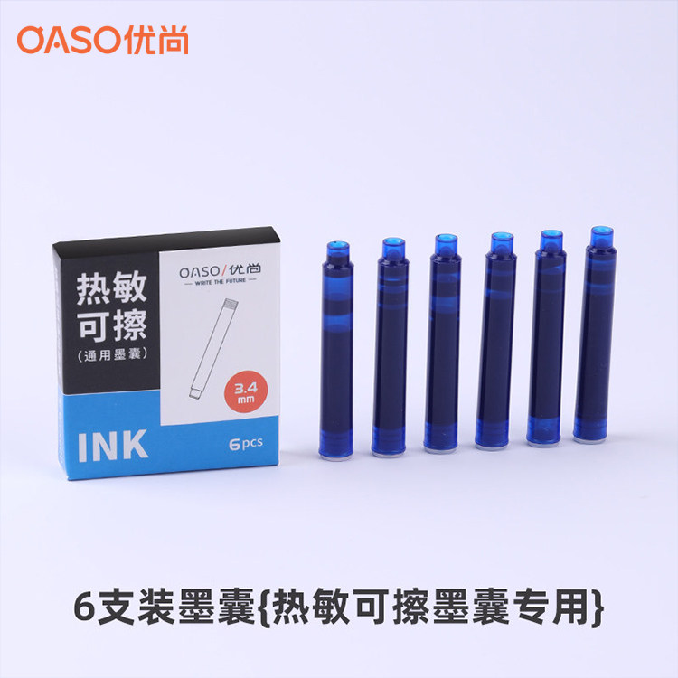 盒 蓝黑色6支 3.4mm内口径 晶蓝色 OASO优尚热敏可擦墨囊K019按动钢笔小学生专用热可擦墨囊替换墨胆墨水黑色
