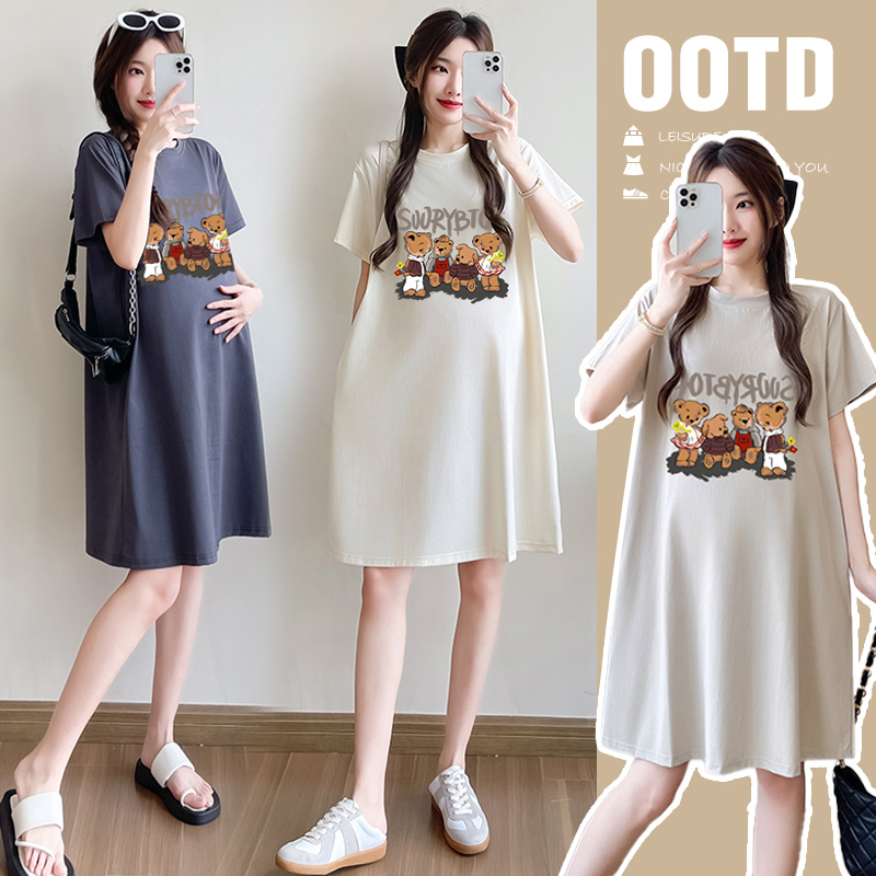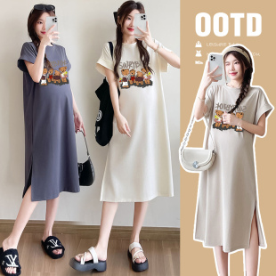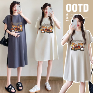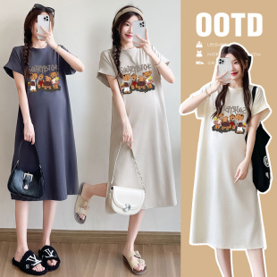 韩版 连衣裙2025新款 卡通印花短袖 纯棉中长款 T恤裙 孕妇装 大码 夏季