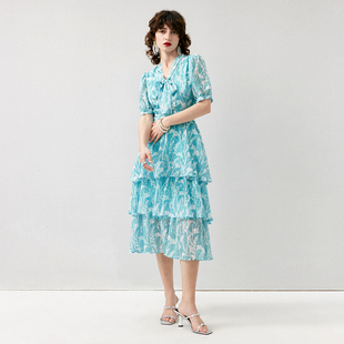 菲梦伊原创蓝色金丝绒绣花连衣裙女冬季 复古高腰轻熟气质A字裙子