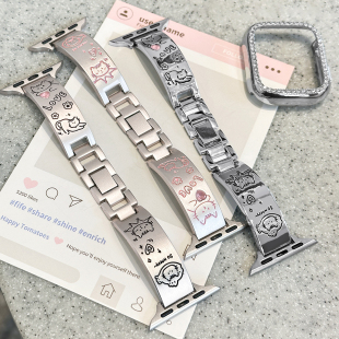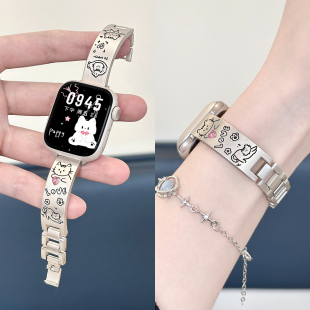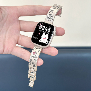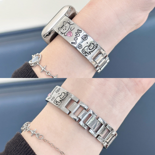 适用iWatchS11金属彩石表带applewatch10 水钻印花不锈钢女夏 se苹果手表ultra可爱新款 猫咪手镯款