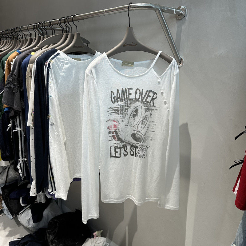 防晒衣圆领长袖 字母图案打底衫 t恤单肩露355 卡通薄款 duoduo
