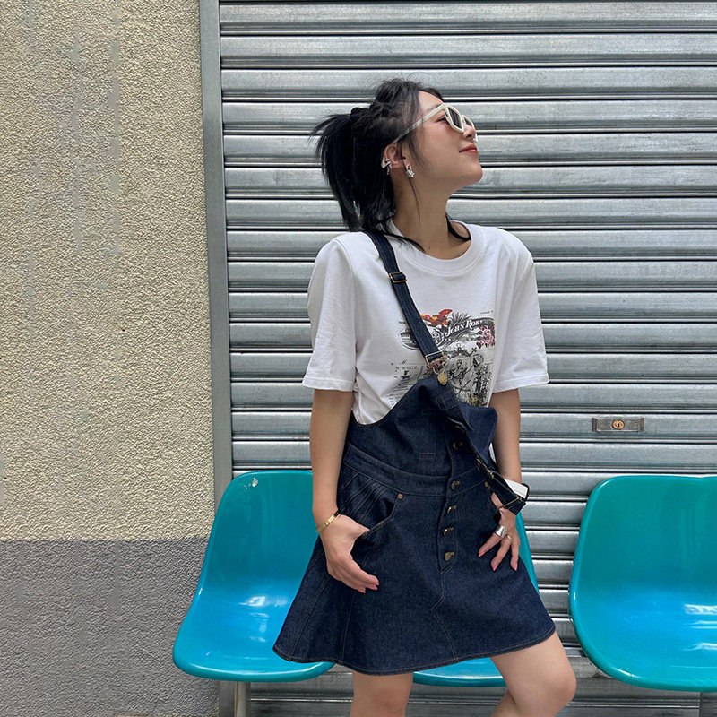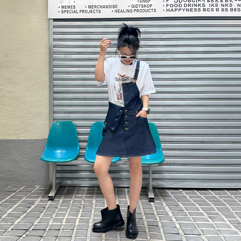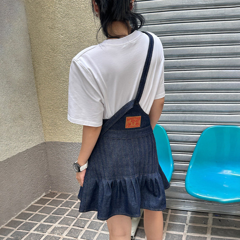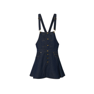 小众设计高级感深色休闲短裙 新款 LEDIM WANG背带牛仔连衣裙女夏季