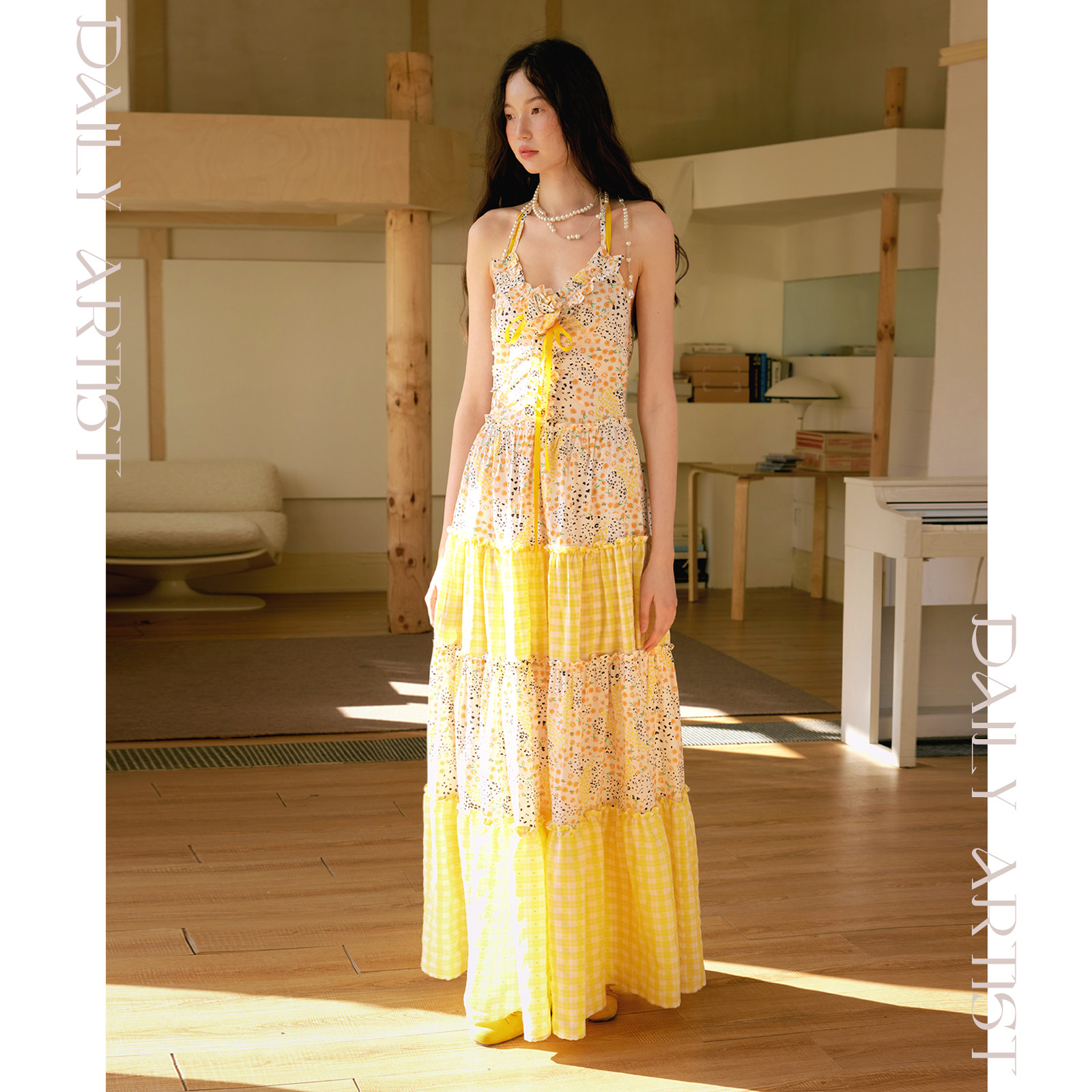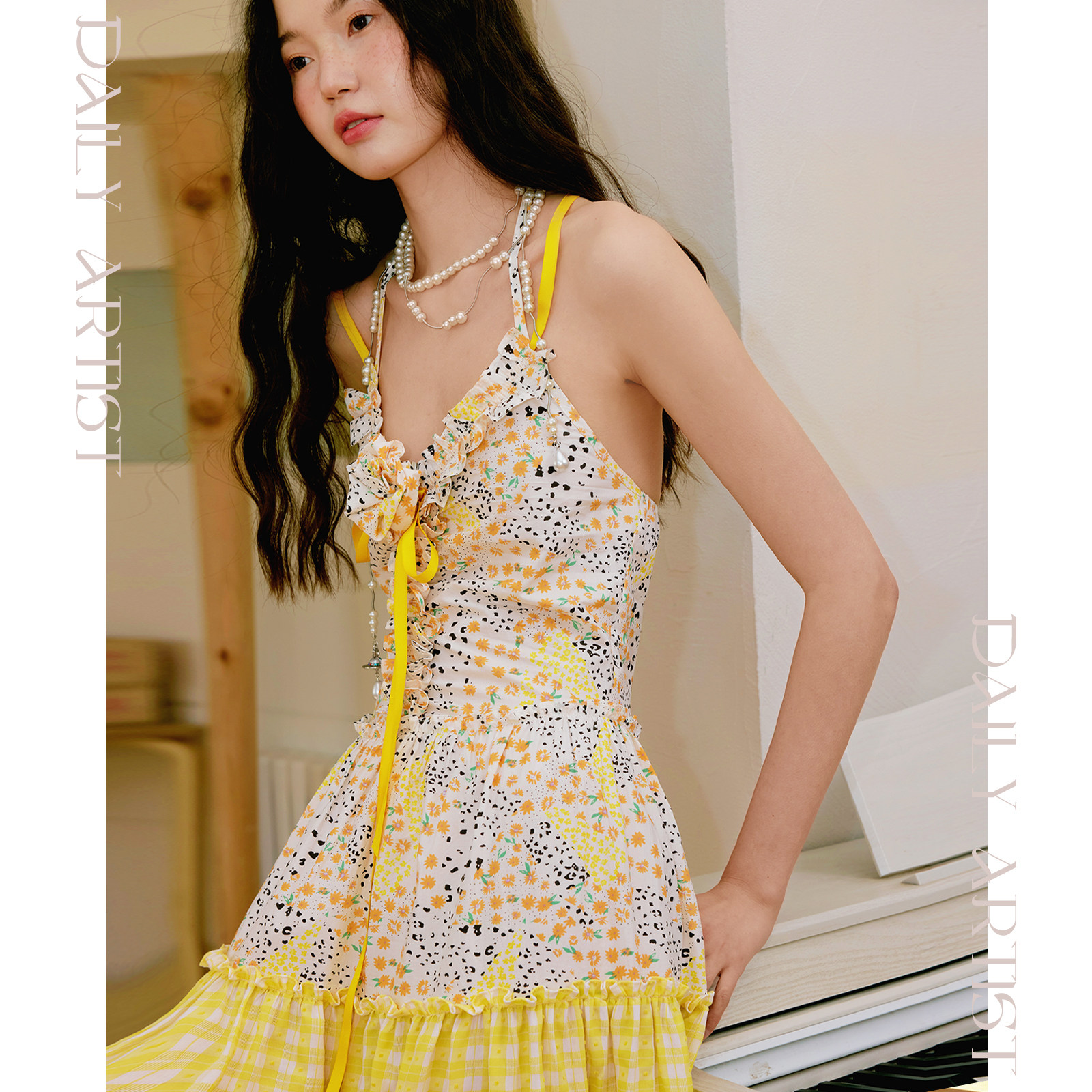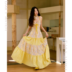 今日艺术家原创黄色碎花蛋糕吊带连衣长裙