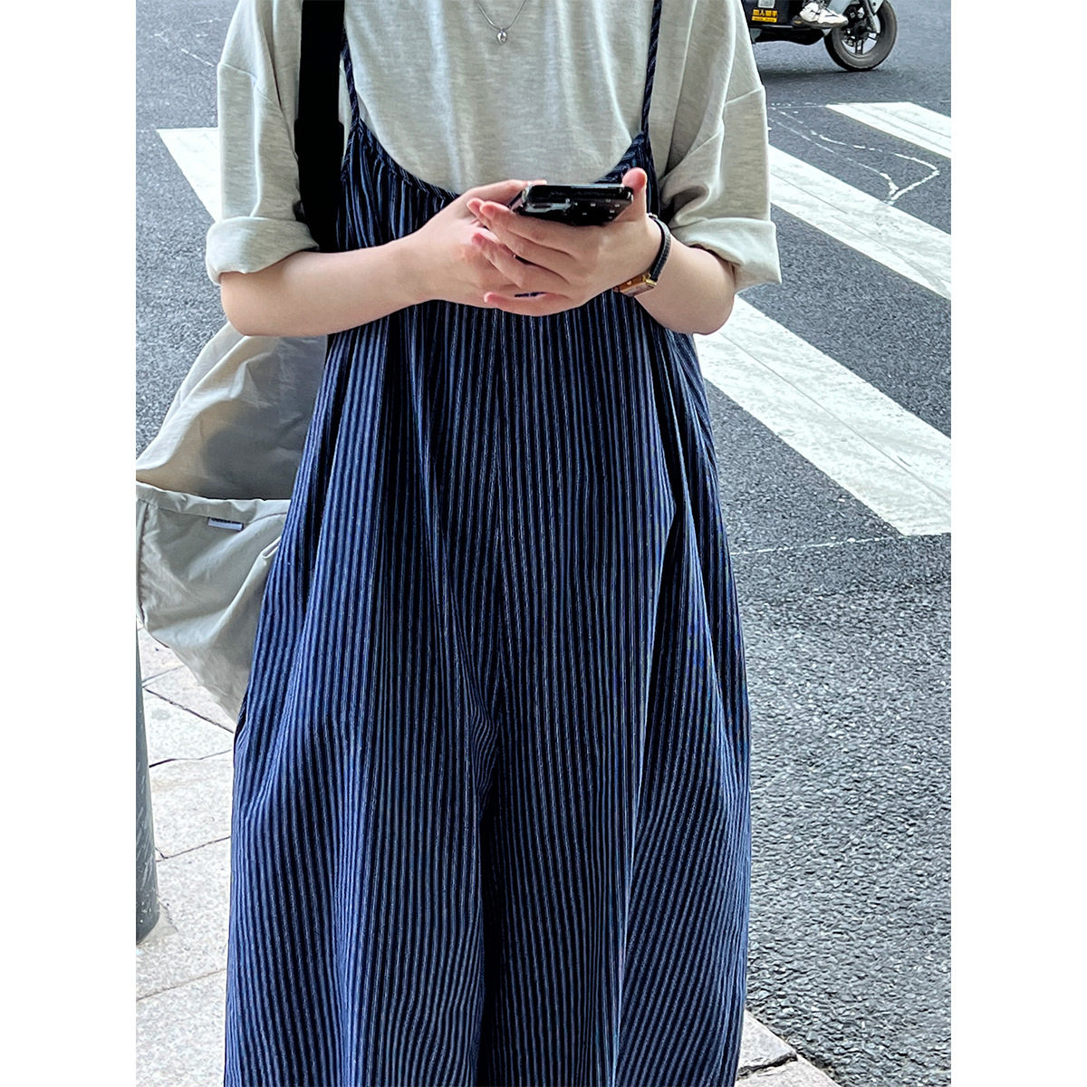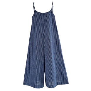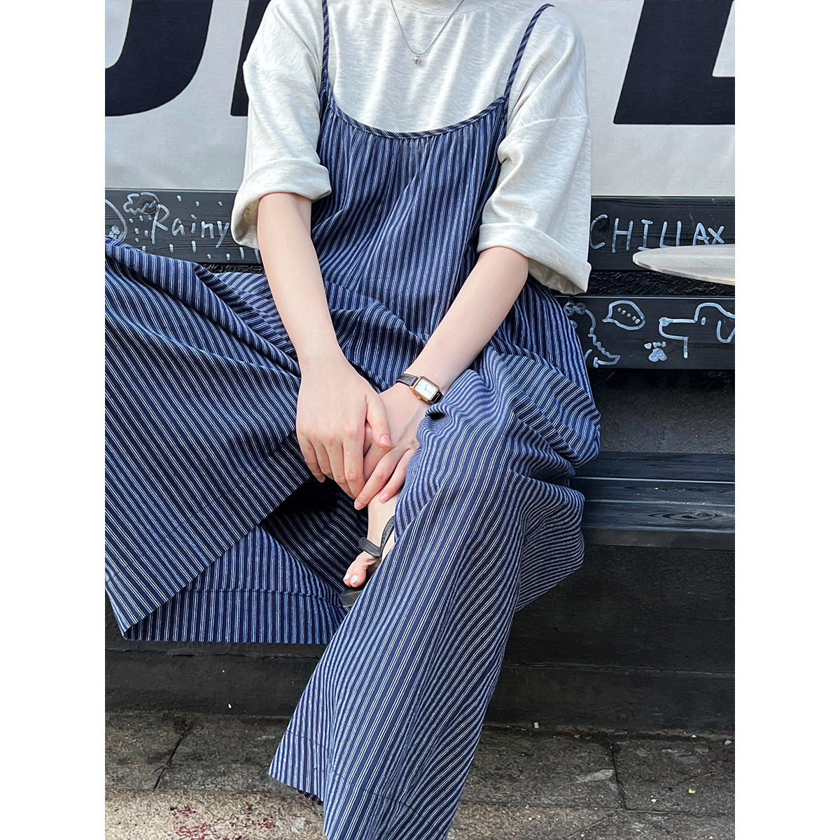 裙 宽松休闲阔腿慵懒风减龄吊带连体裤 孕妇复古蓝色条纹背带裤 秋季
