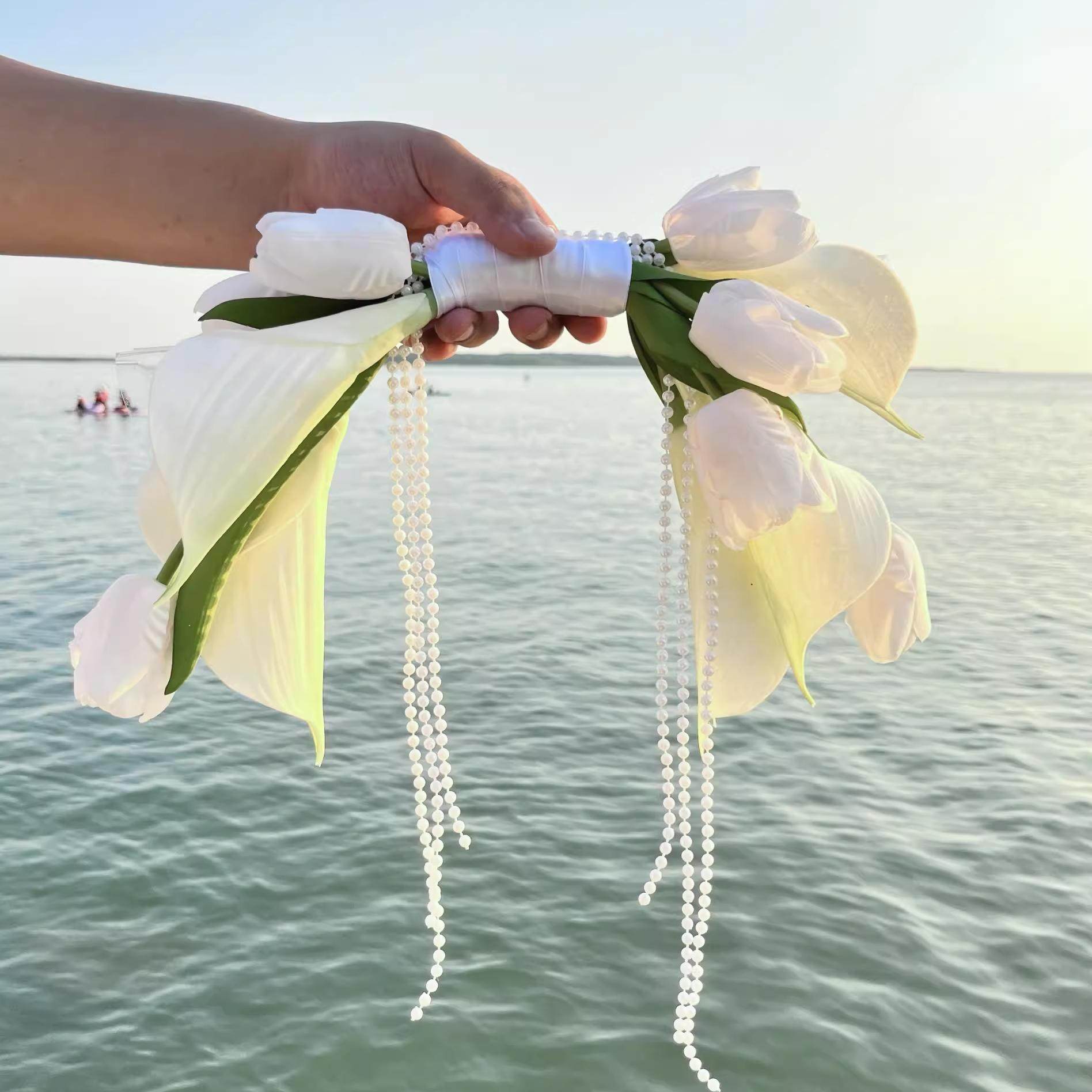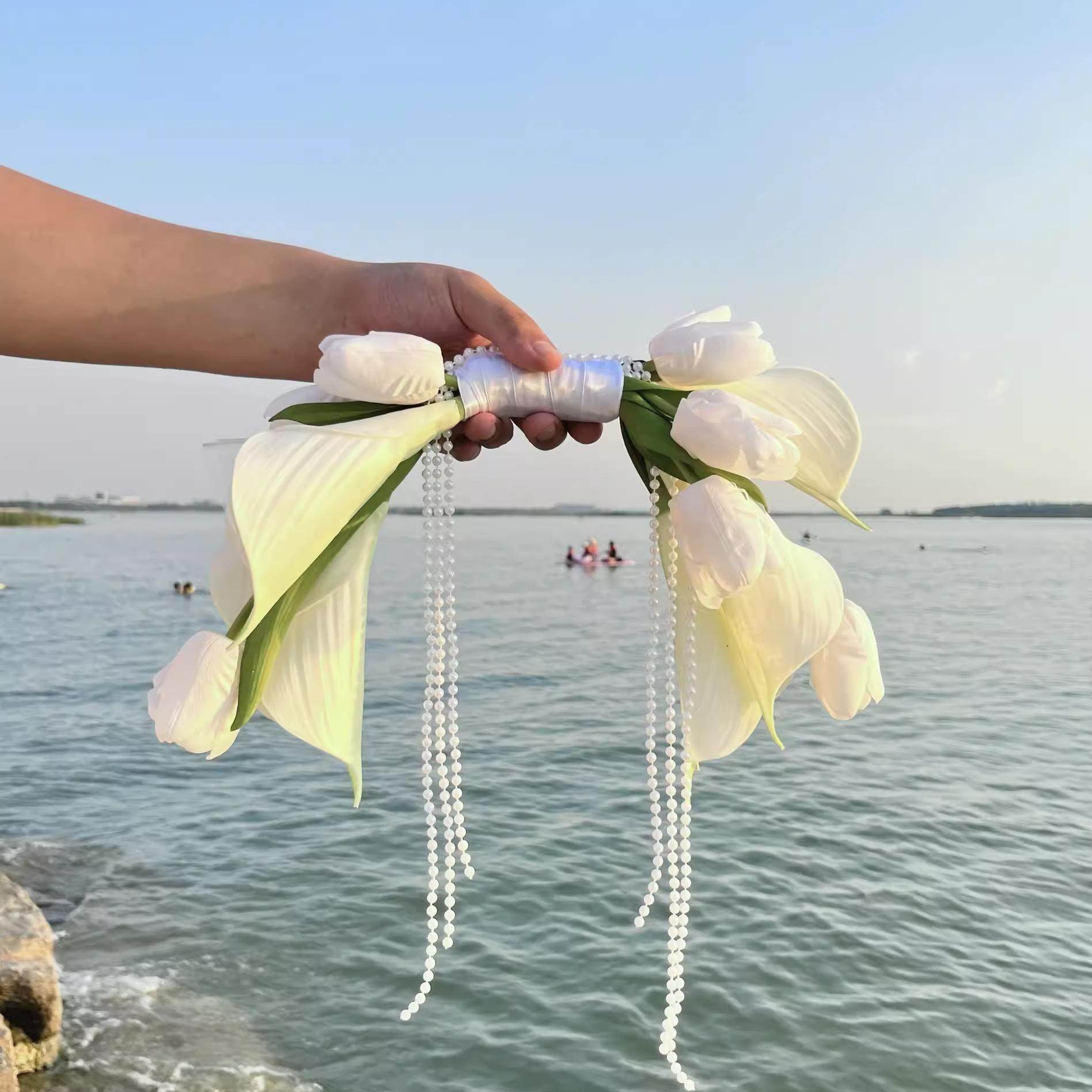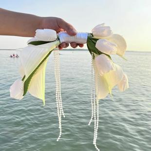 韩式 领证花束婚礼高级手提花环新娘白色郁金香手捧花婚纱拍摄道具
