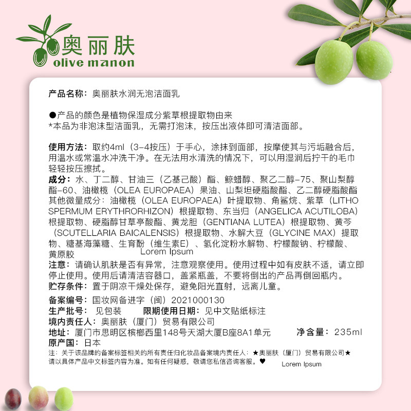 Olive奥丽肤水润无泡洁面乳敏感肌免水洗深层清洁毛孔洁面乳日本