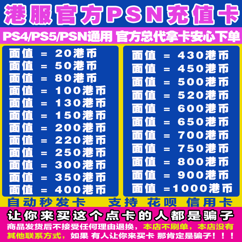 750 1000港币 150 400 500 300 PSN港服点卡PS5充值卡PS4预付卡HK80 200 800 600 官方秒发