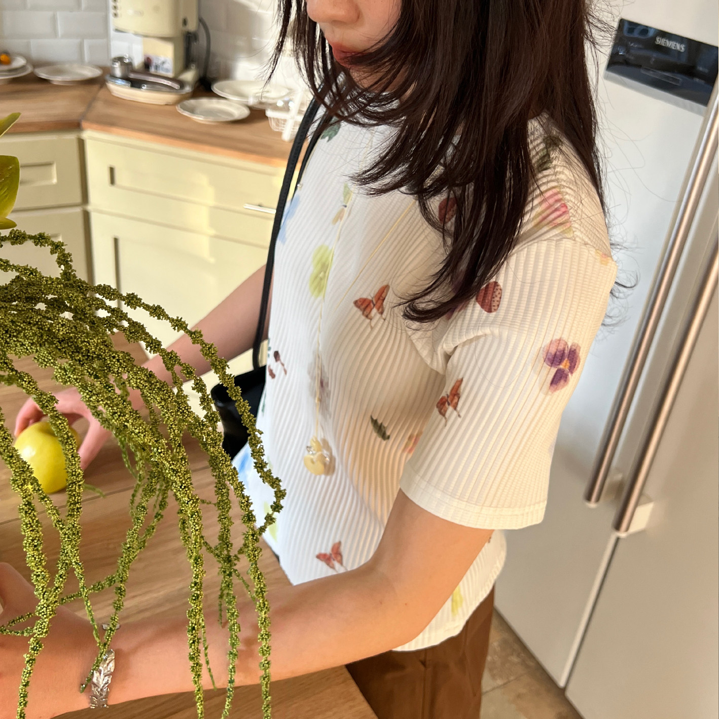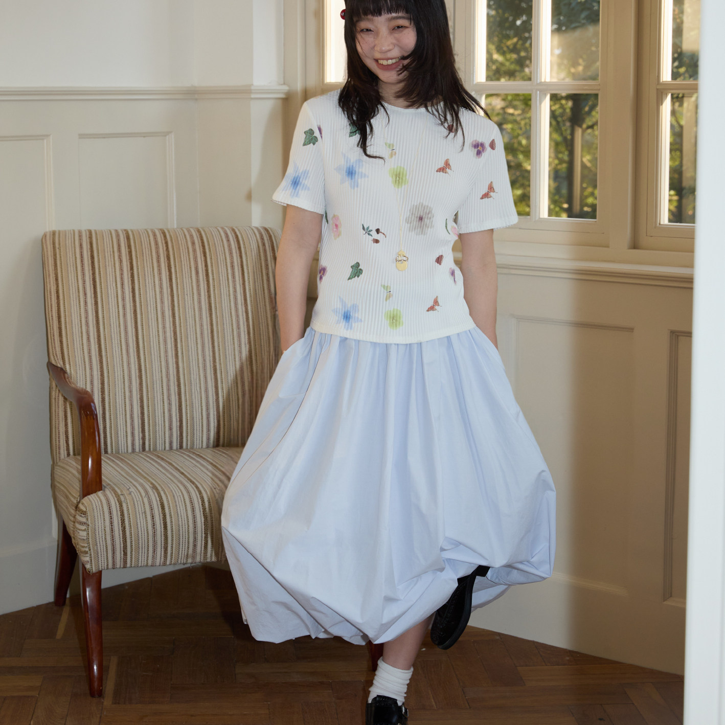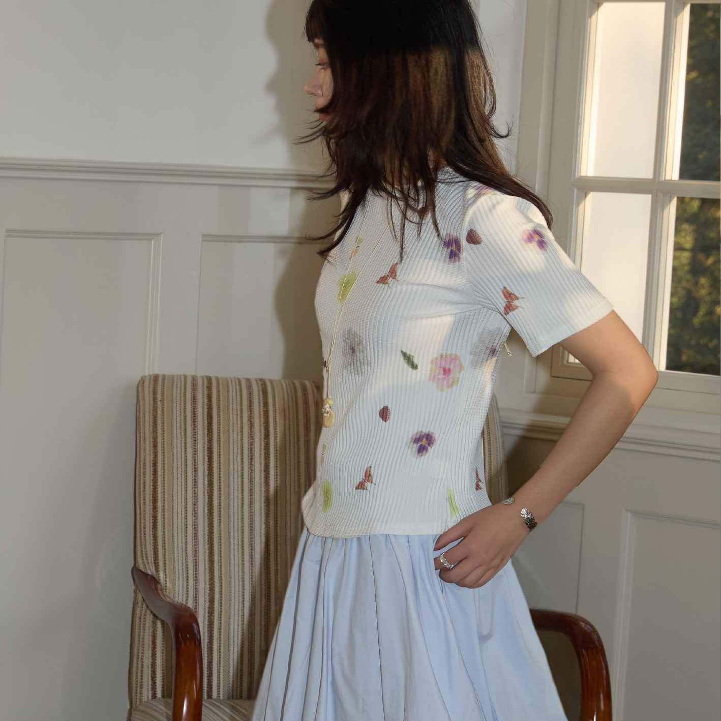 时髦压褶圆领T恤 上衣 nothe Case「花园小憩」温柔印花短袖