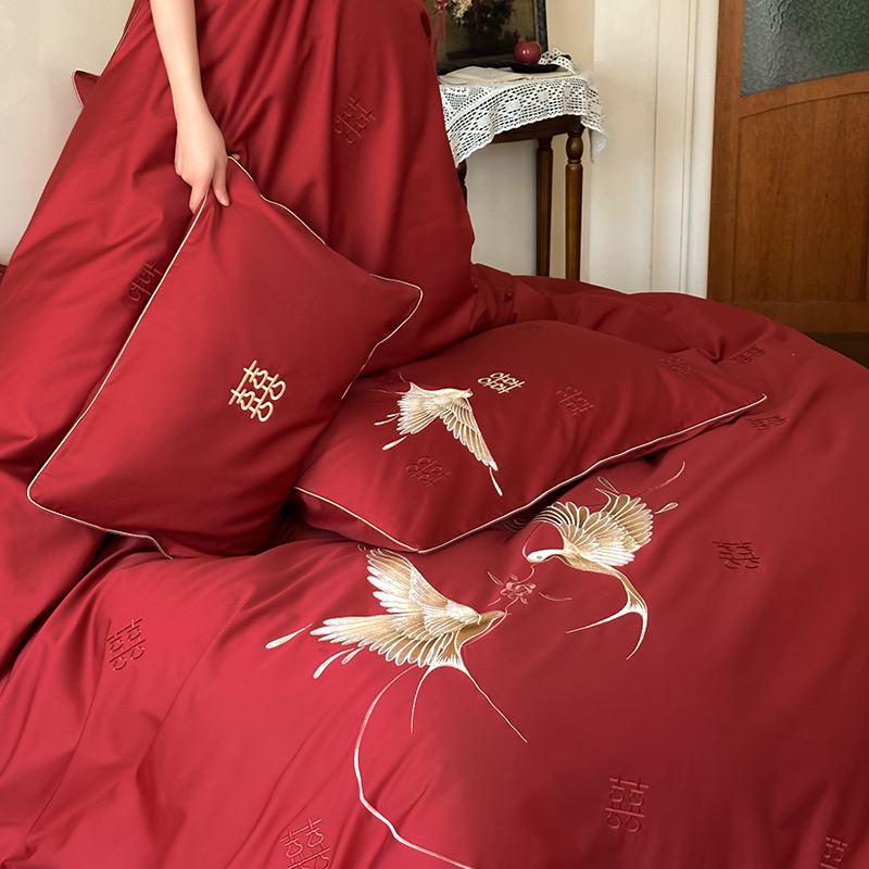 水星家纺100S长绒棉婚庆四件套红色全棉结婚套件婚房喜庆轻奢床品