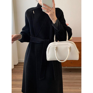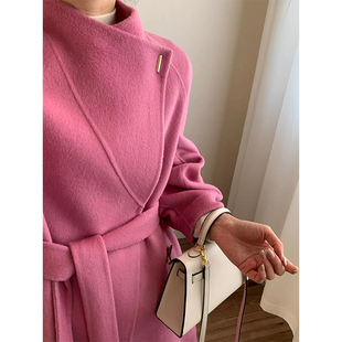 玫红色双面羊绒大衣女中长款 高端系带气质羊毛呢外套 2025秋冬新款