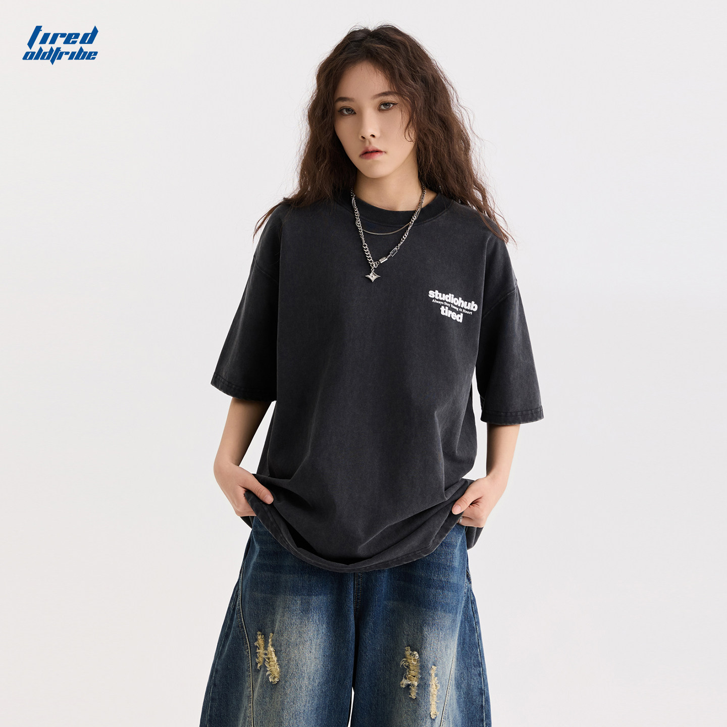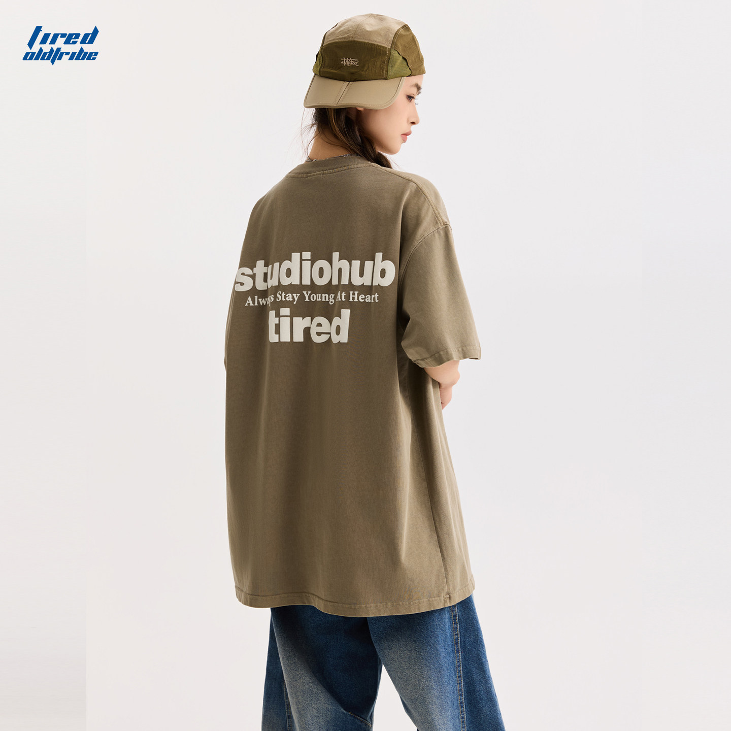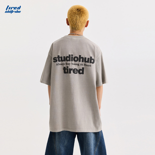 国潮街头tee宽松百搭体恤 t恤夏季 TIRED美式 280g水洗植绒印花短袖