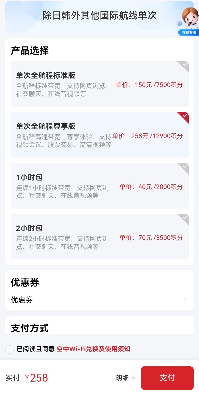 日韩除外 东航机上Wifi 单次卡 258款 国际尊享版