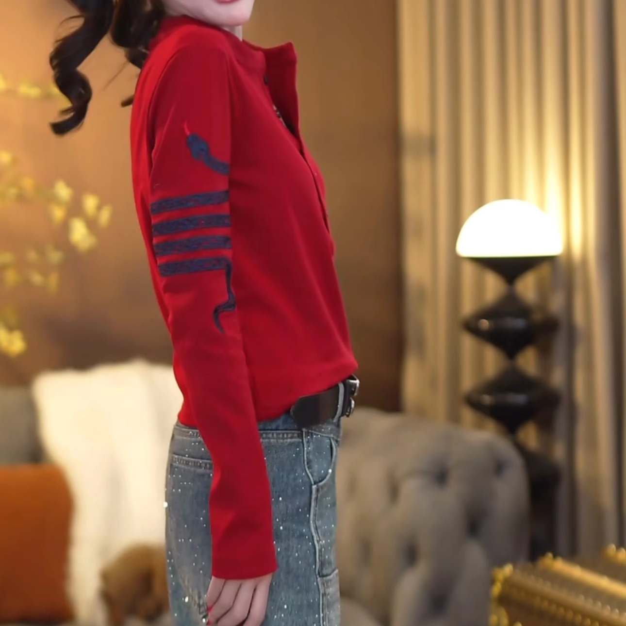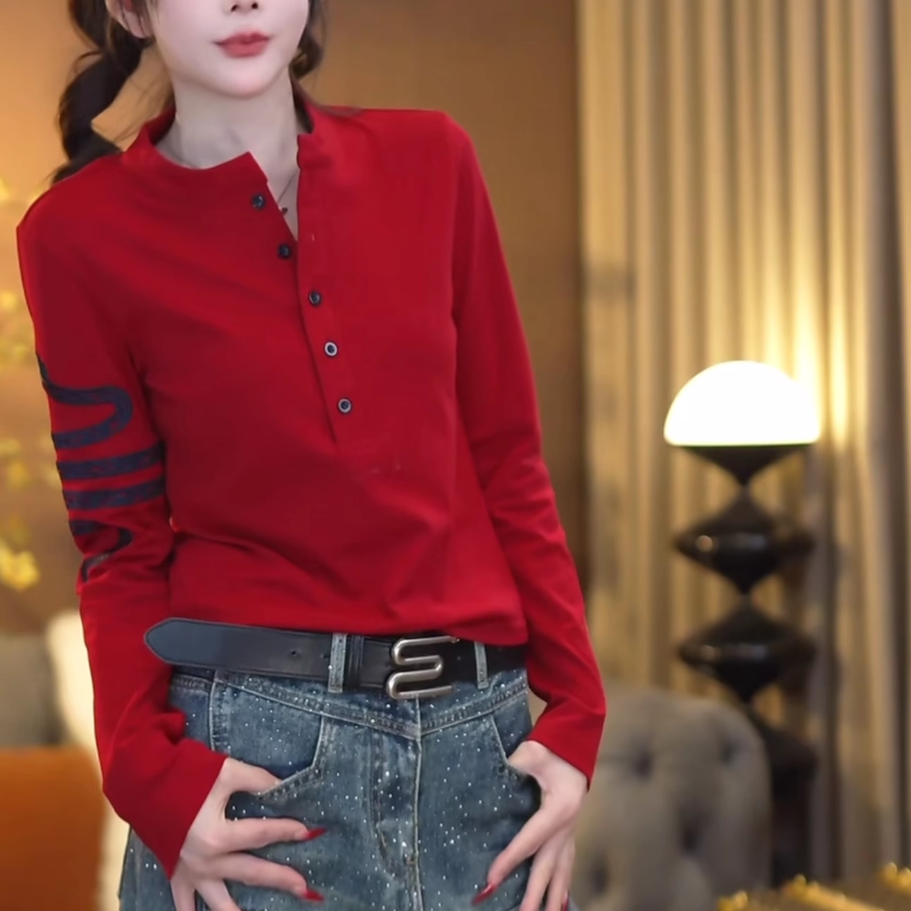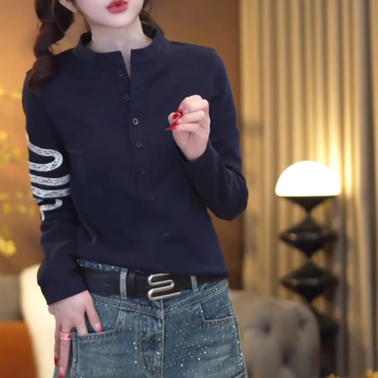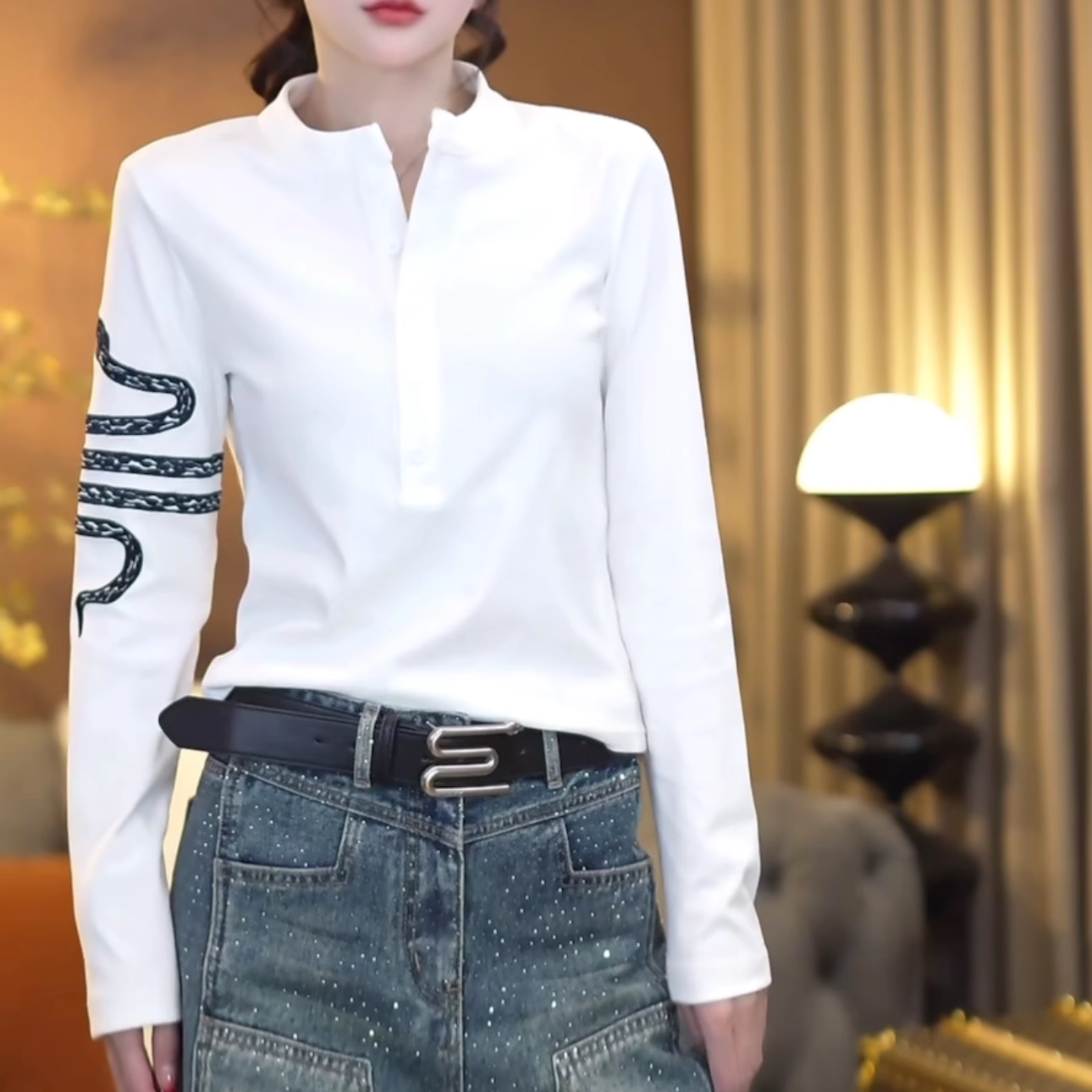 T恤女休闲百搭显瘦设计感上衣潮 蛇年刺绣半纽扣长袖 2025春季 新款