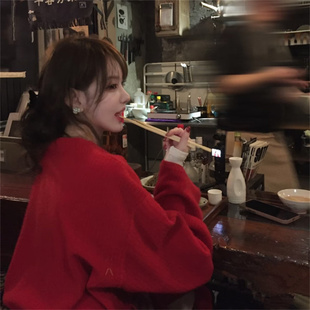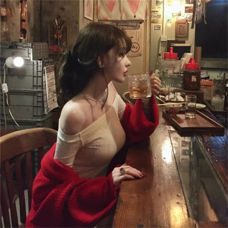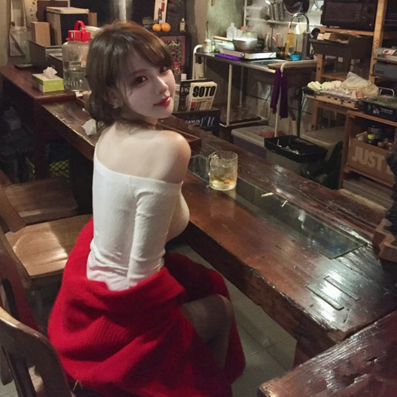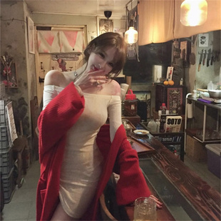 网红花三三同款 连衣裙浴袍红毛衣 穿搭白色蕾丝一字领弹力收腰长袖