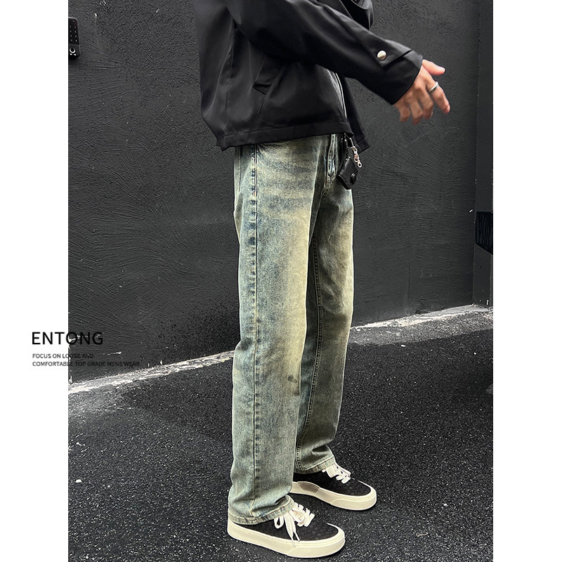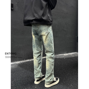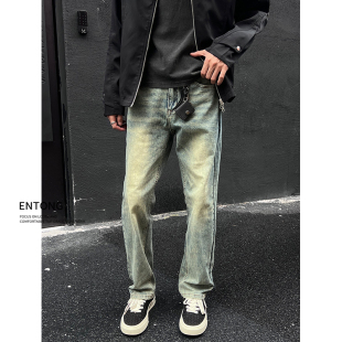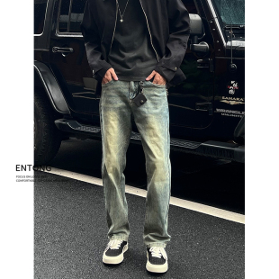痞帅潮流高街直筒宽松长裤 Entong秋季 男士 复古做旧牛仔裤 新款