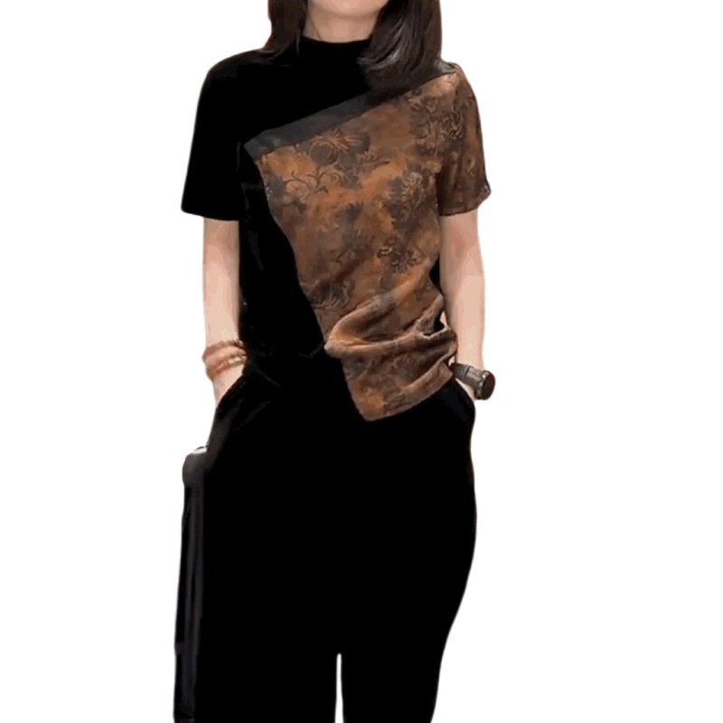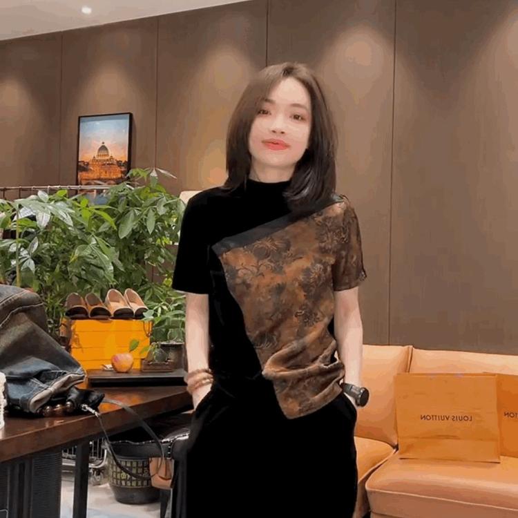 高领黑色上衣 T恤女丝绒拼接醋酸雪纺打底衫 法式 高级感金丝绒短袖