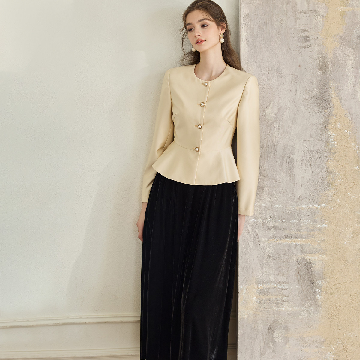 罗衣荷叶边收腰浅黄短外套女春通勤圆领修身 高级感百搭上衣11280