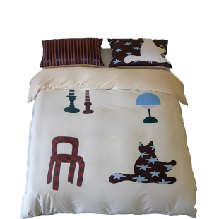 ins风长绒棉全棉四件套印花猫咪花瓶条纹纯棉被套四季 复古风床品