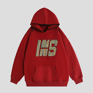 编织贴布刺绣LOGO卫衣宽松加绒连帽衫 INSstudios 国潮牌情侣美式