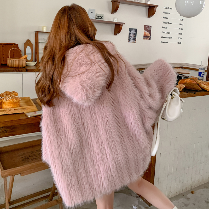 连帽毛毛上衣 加厚羊羔毛外套环保皮草毛茸茸衣服中长款 冬季 女新款