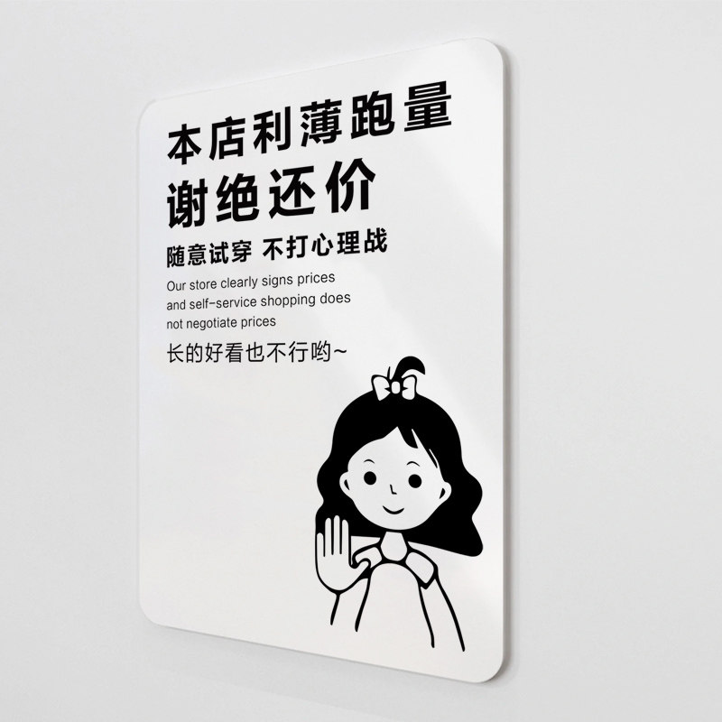 谢绝还价提示牌服装 店不议价牌子概不赊账温馨提示贴纸利薄跑量不还价标牌定制