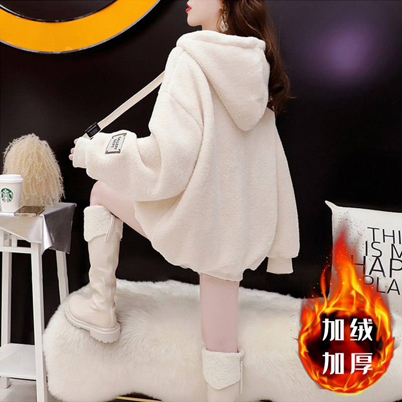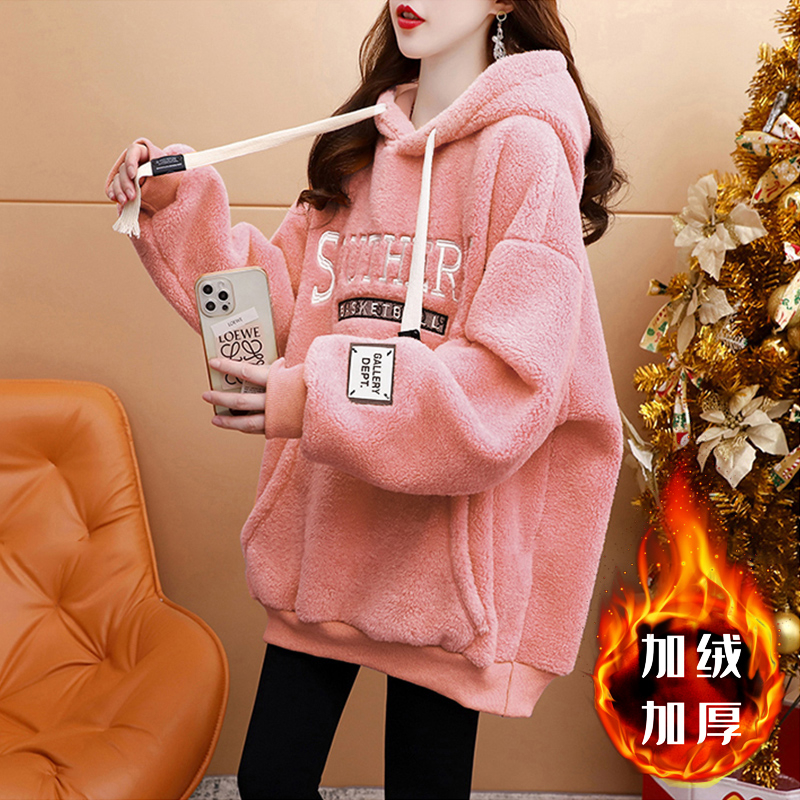 欧货大版 200斤遮肚子刺绣外套 羊羔绒连帽卫衣女加绒加厚胖mm大码