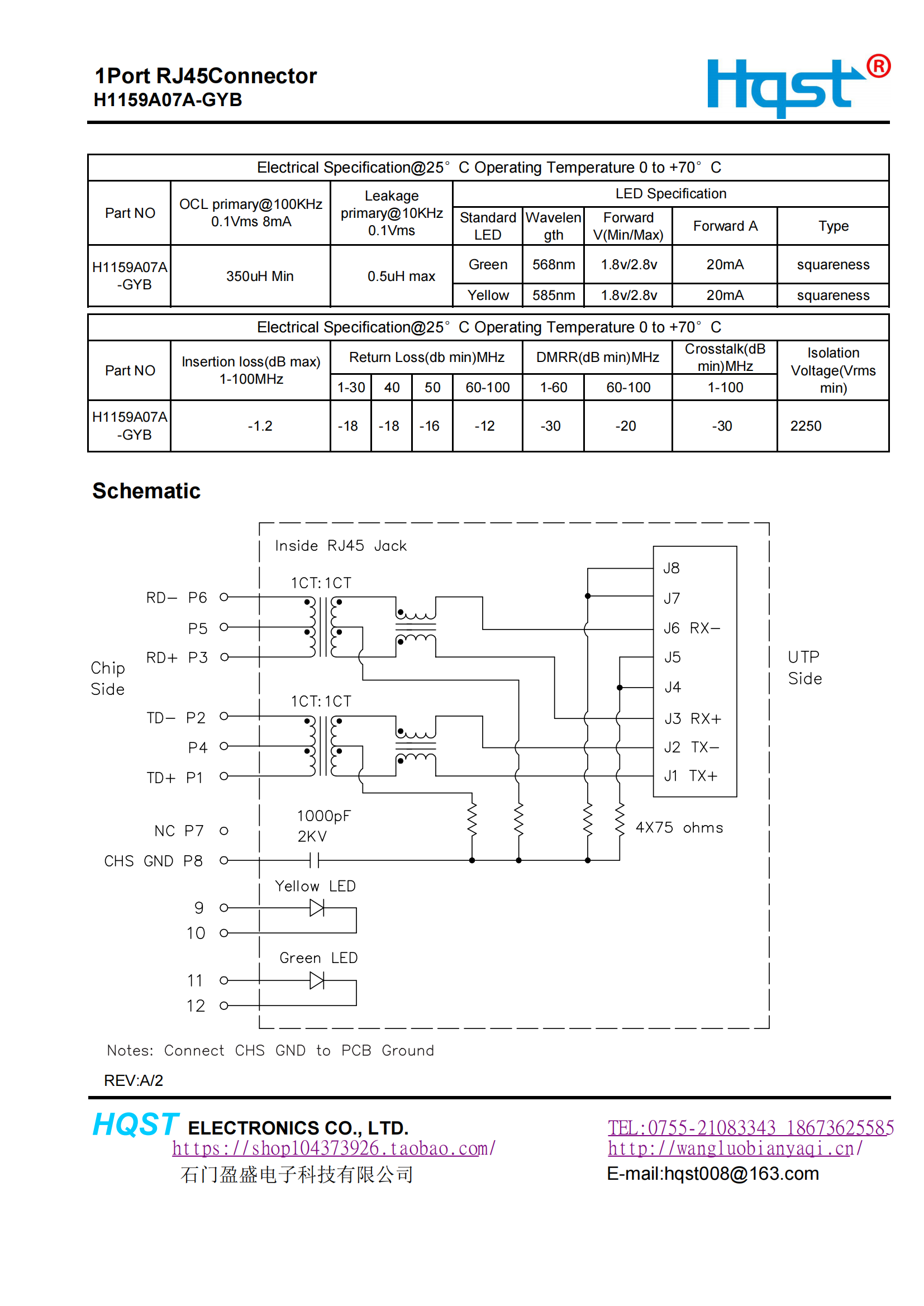 H1159A07A卧式 HR915340A RJ45集成百兆网络滤波变压水晶头连接器