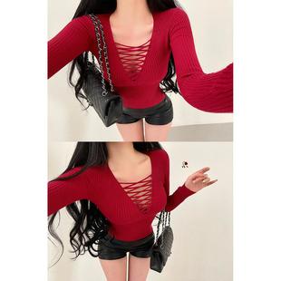 上衣 打底针织衫 YoungGirlDay纯欲风性感胸前绑带镂空修身 显瘦长袖