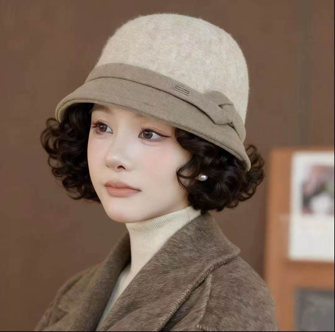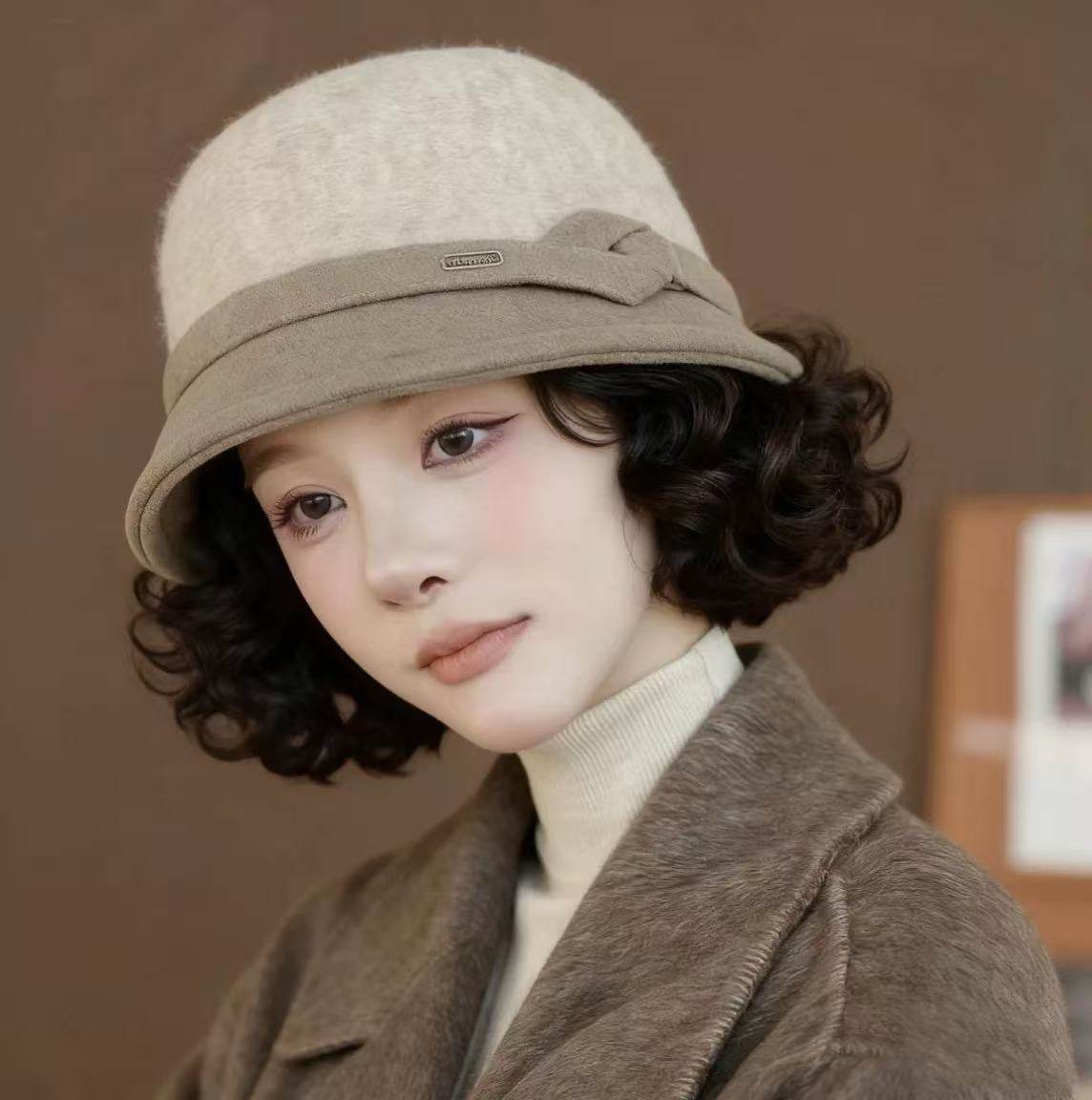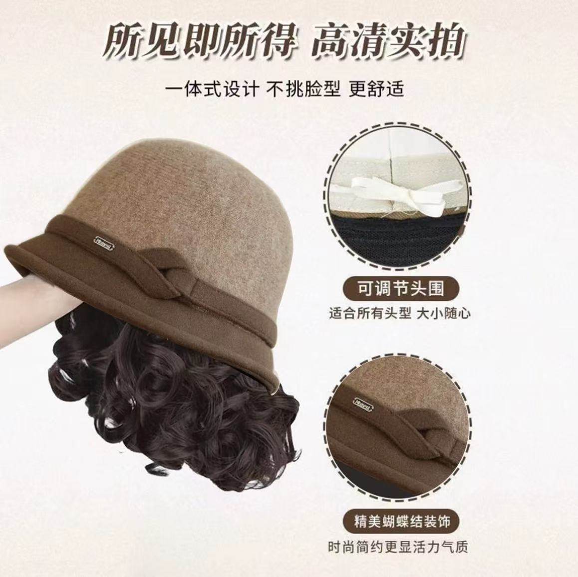 帽子假发一体秋冬新款 加厚羊毛呢渔夫帽慵懒卷洋气减龄短卷发头套