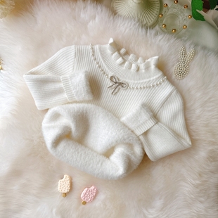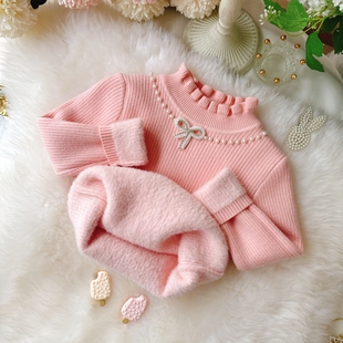 女童套头针织衫 儿童毛衣一体绒2025冬款 女童花边领纯色加绒打底衫