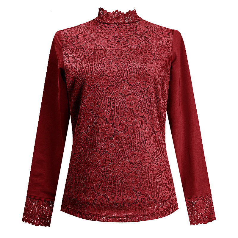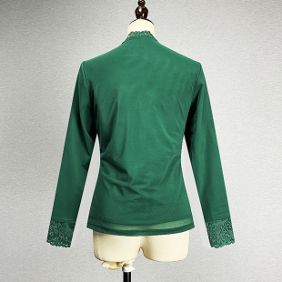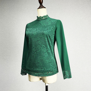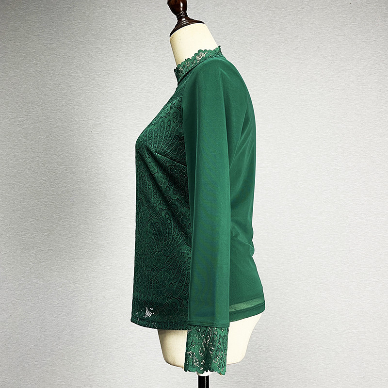 镂空性感立领红色保暖打底衫 女2025弹力修身 蕾丝衫 绿色加绒九分袖