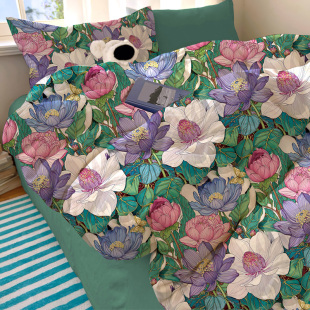 国风荷韵荷花绿色水洗棉床上用品三四件套被套床笠床单亲肤棉超柔