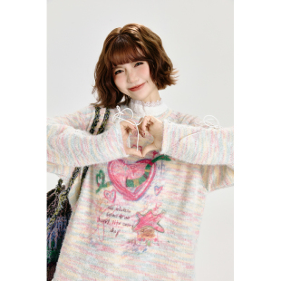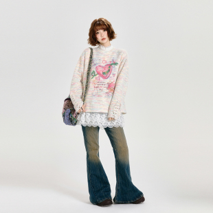 绑带设计宽松上衣 女春秋款 Girlyhalo美式 复古卡通涂鸦圆领针织衫