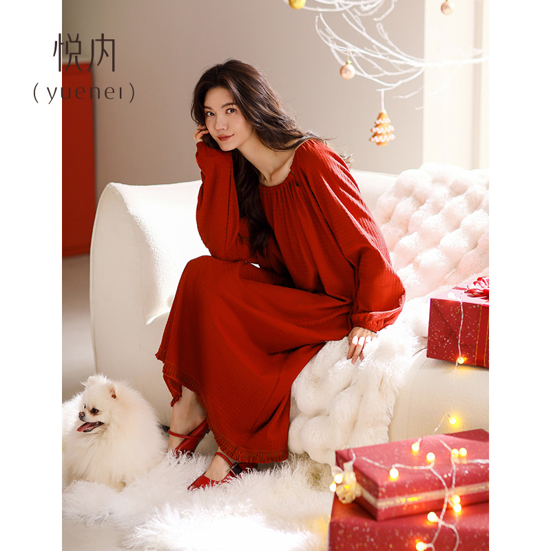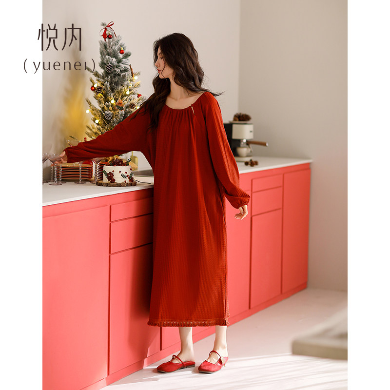 流苏长款 纯棉大码 红色本命年马年新年 长袖 悦内睡裙女士睡衣春秋款