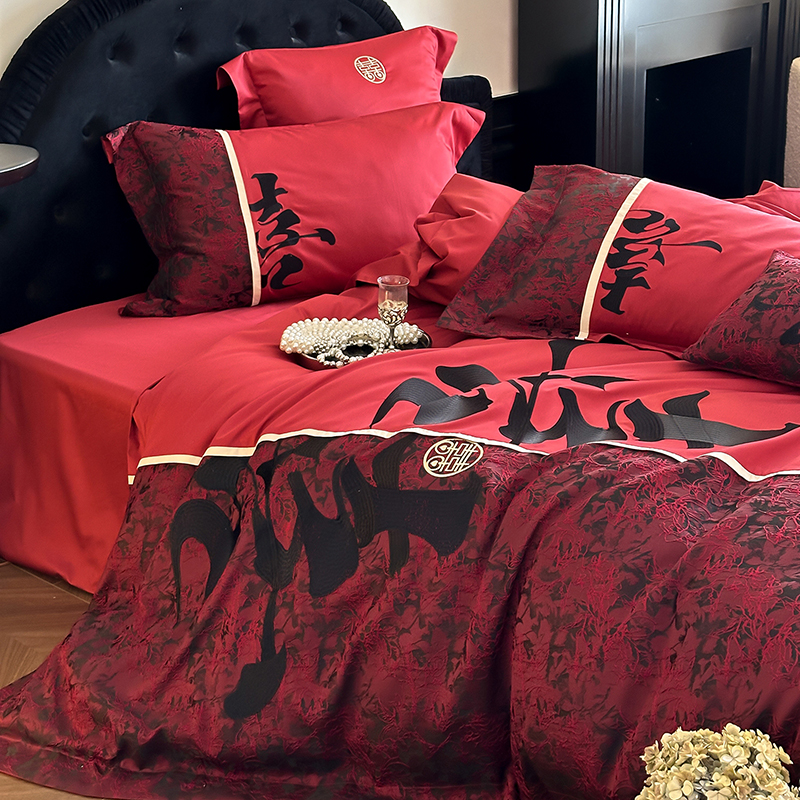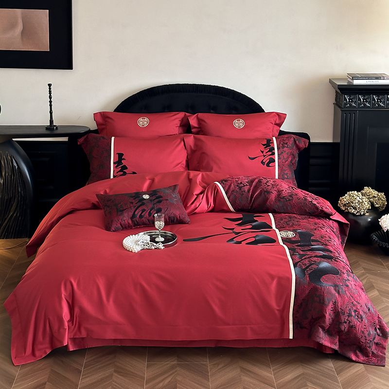 水星家纺100S长绒棉婚庆四件套红色全棉结婚套件婚房喜庆轻奢床品
