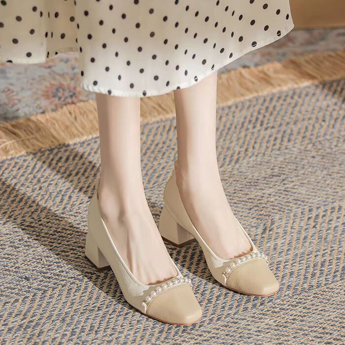粗跟温柔珍珠拼色复古玛丽珍中跟单鞋 小高跟鞋 女 方头法式 2024新款