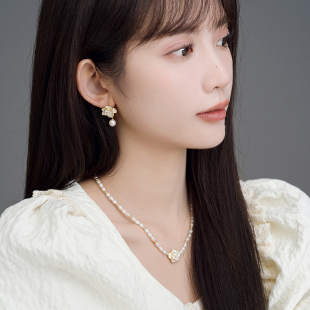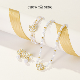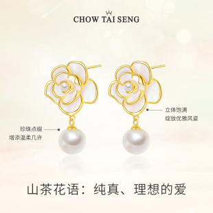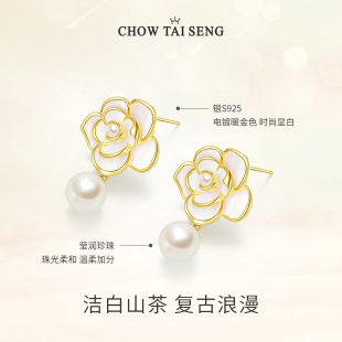 周大生山茶花珍珠耳钉耳环纯银女生轻奢耳饰小香风生日礼物送妈妈