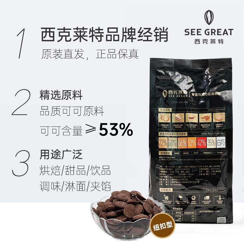 西克莱特牛奶巧克力币53%可可含量纽扣型1kg 西点烘焙甜品原料